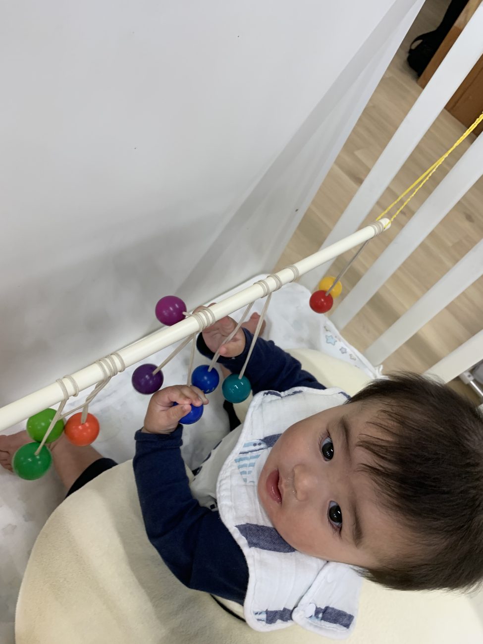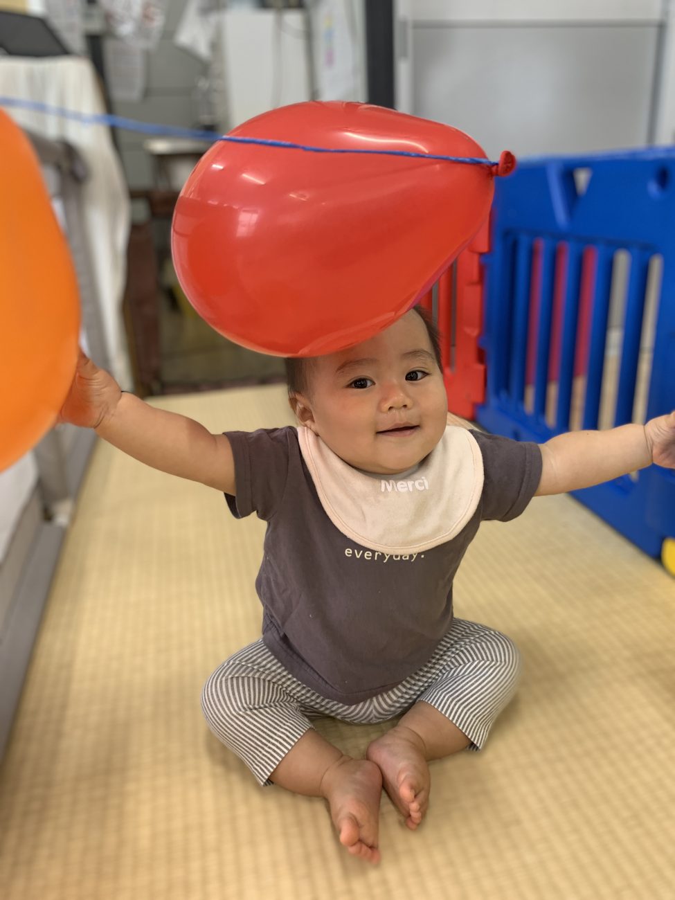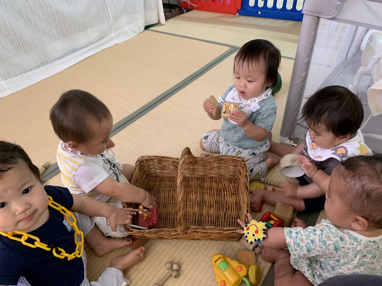 初めは各々好きなおもちゃを見つけ1人で遊ぶことを楽しんでいましたが、徐々に友達の存在を意識し始め、一緒に絵本を見ることから始まり(物の共有)、今では段ボールの中に一緒に入りバスごっこ(場の共有)を楽しむ姿も出てきました。最近では喃語や指差しで子どもたちのみでやりとりする姿をよく目にします。私には分からなくても子どもたち同士ではしっかり理解し合い一緒に遊ぶ姿をみて子どもたち同士で通じ合っているのだなと実感しました。