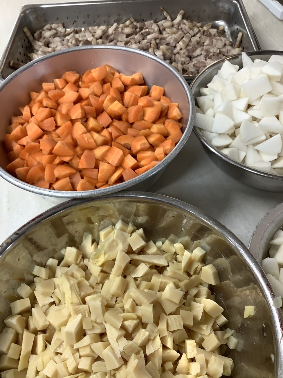 保育園の豚骨風煮は、肉の名門一真の豚ばら肉.こんにゃく.人参.里芋.椎茸.筍を麦味噌.きび糖.味醂.醤油で煮込みました。豚肉にお酒を振りスチームコンベンションにかけることで、臭みを抜くとともに旨味を吸わせてから煮ます。とろりとした舌触りと大根やごぼうなどの風味が、味噌味と溶け合い美味しい煮物になりました。旬の筍は、今年初めて給食に使用しました。筍のシャキシャキした食感もいいアクセントになりました。
