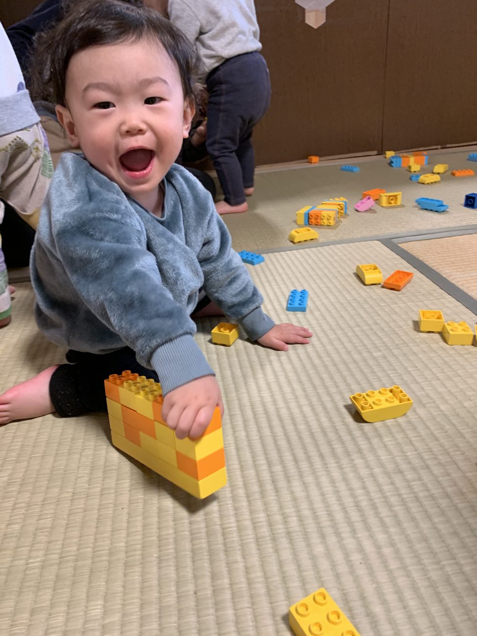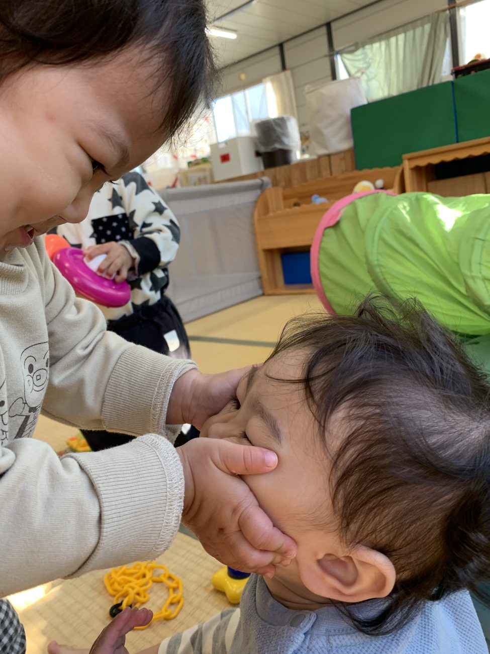 玩具を取られても呆気に取られ、違う玩具を見つけて遊び込んでいた子ども達も、少しずつ「自分の!」と強い思いが芽生えてきました。その思いを声や身体で伝える姿が見られ、”自分”をより表現できるようになっています。