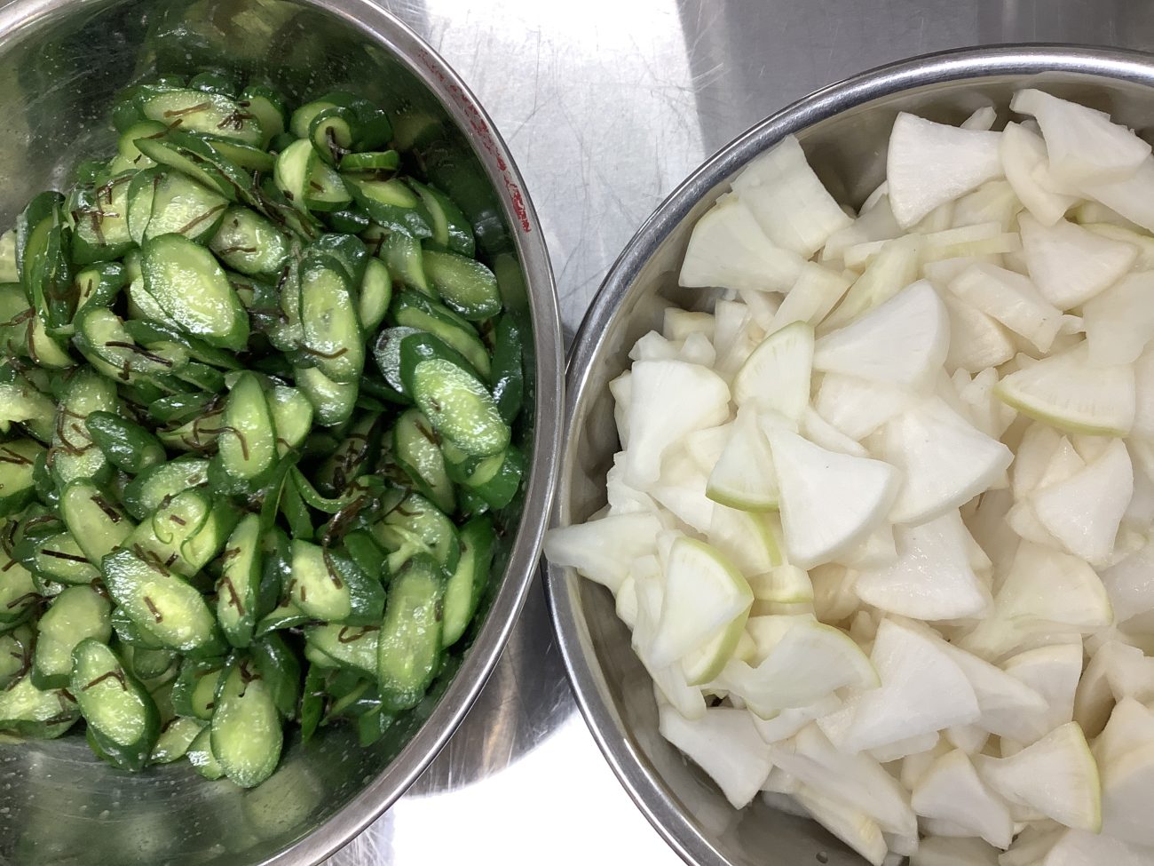 給食室手作りのぬか床で、大根を漬け込みました。