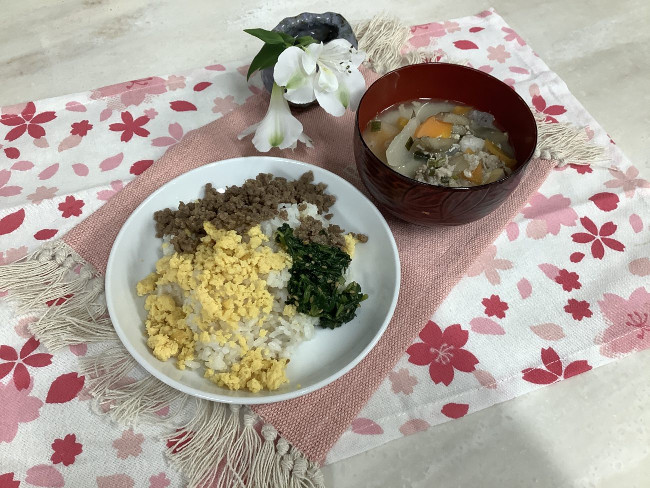合い挽き肉の茶色、卵の黄色、ほうれん草の三色で彩り綺麗なお皿に仕上がり、こどもたちの食欲をそそる一品になりました。何度もお代わりに来てくれたこどもたちもいましたよ!
