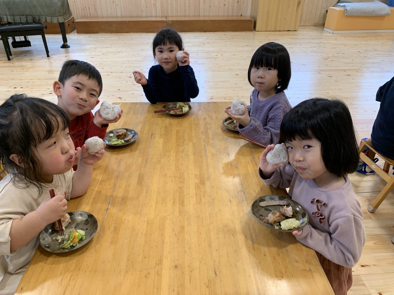 4月から年長さくら組‼︎ 就学を踏まえ、3月から少しずつ「おかわりは○時までに、○時までに食べ終わろう」と時計を見て始めと終わりの時間を決めて取り組んでいます。これからも食べるの大好き!なみんなでいてほしいです。 文責:大迫