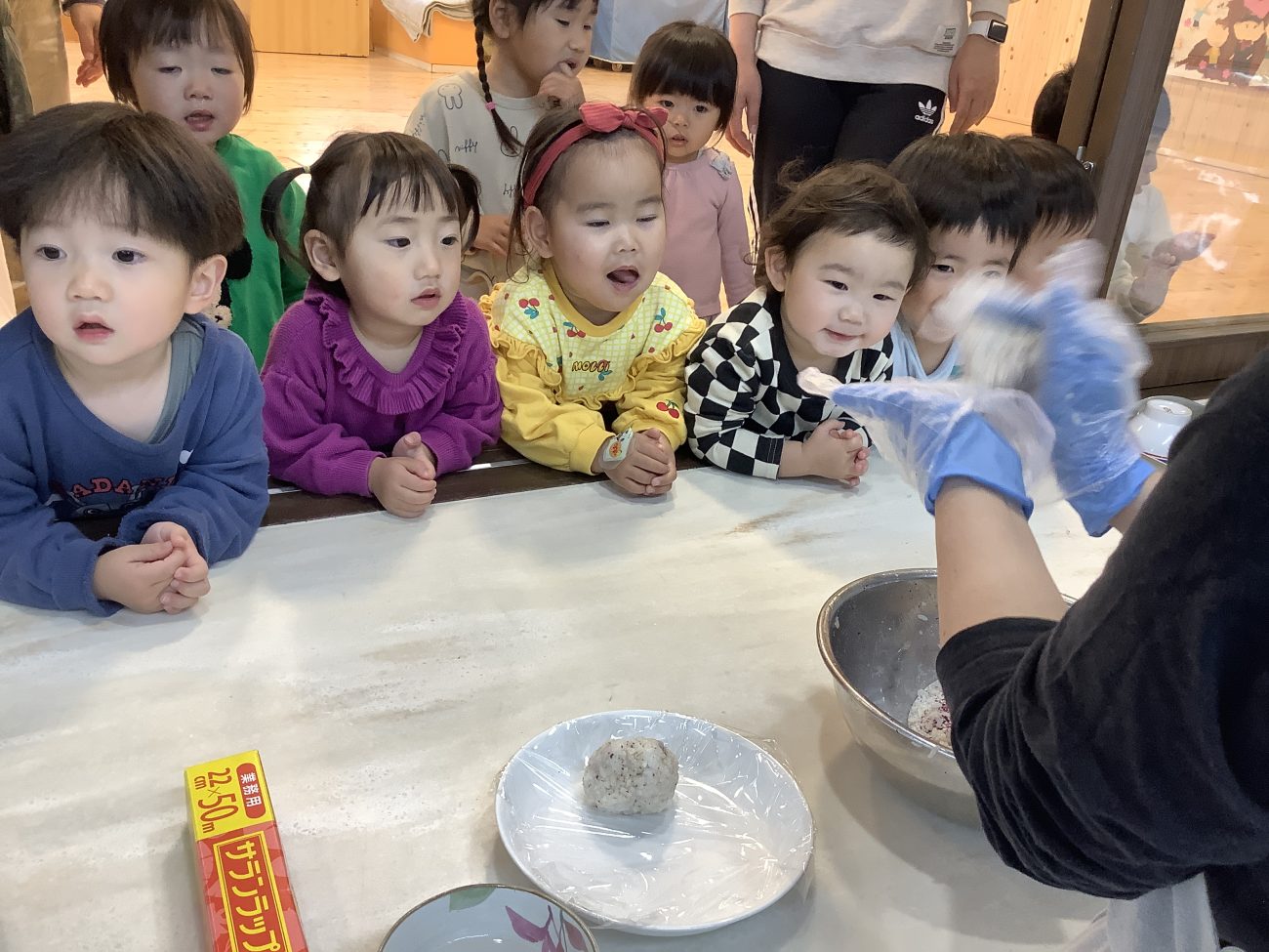 小さいお友だちには、給食室まで来てもらい一つ一つに心を込めたおにぎりを作っているところを実際にみてもらいました。