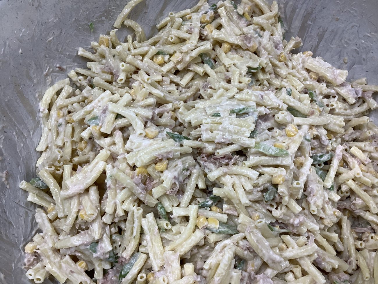 フジッリサラダは、マカロニとアスパラガス、ツナ、コーンを豆乳マヨネーズで和えたサラダです。アスパラガスは、根本の部分が固いため、ピーラーで筋を取り除き、斜めに薄くスライスしてスチームにかけると柔らかく食べやすくなります。