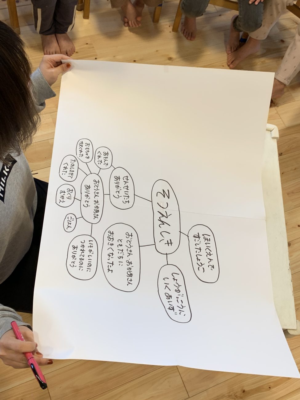 また、お別れのことばを考えよう!とみんなで保育園生活を振り返ると、「保育園、最高に楽しかった!」という意見が沢山でました。