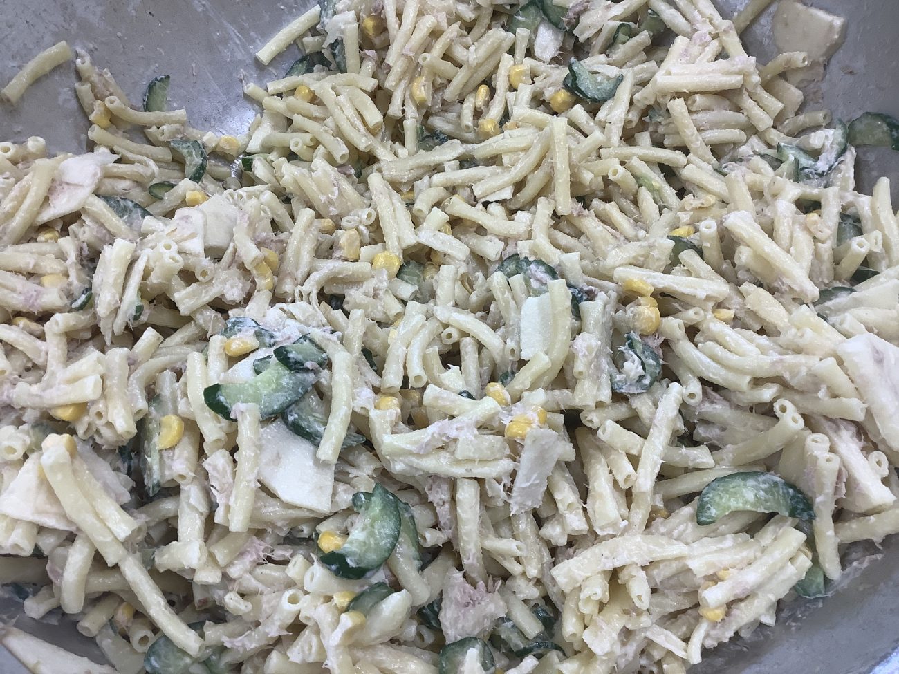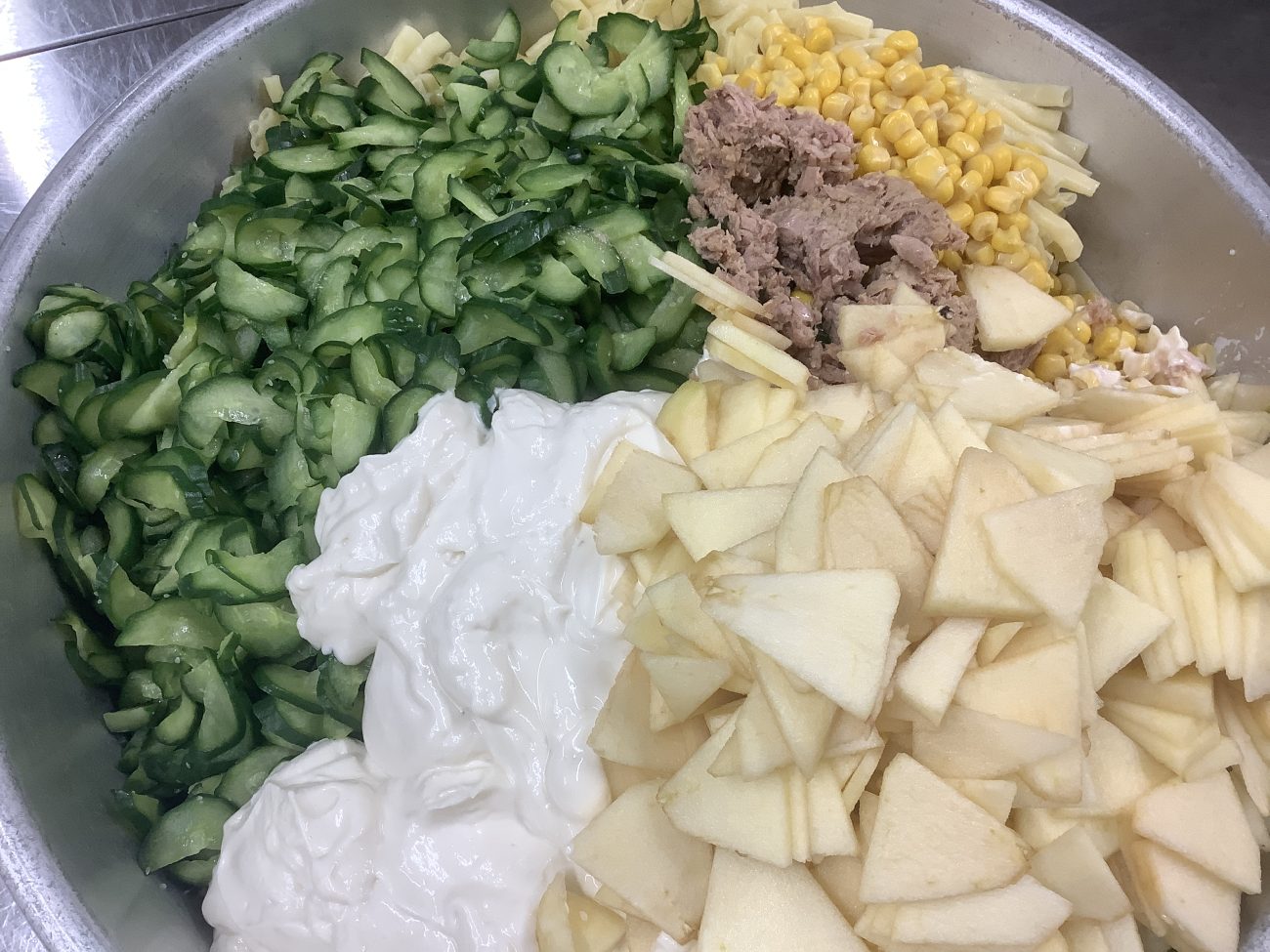 マカロニ、きゅうり、ツナ、コーン、りんごを豆乳マヨネーズで和えたサラダです。