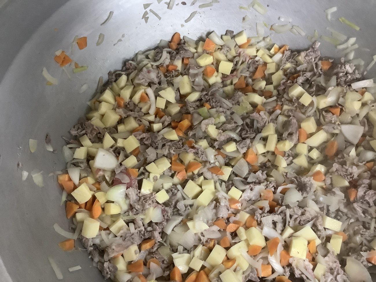 豚肉とじゃがいも、にんじん、玉ねぎ、ピーマンを炒めてから煮込み、ルーを加えてカレーを作ります。