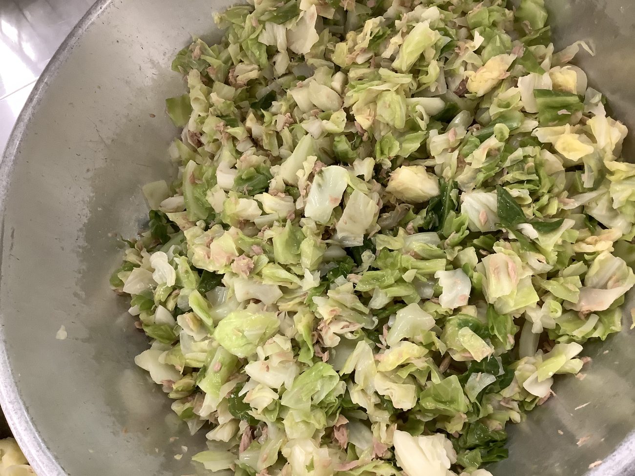 手作り豆乳マヨネーズと南州農場のベーコンをたっぷりと加え、丸めたパンを焼き上げます。