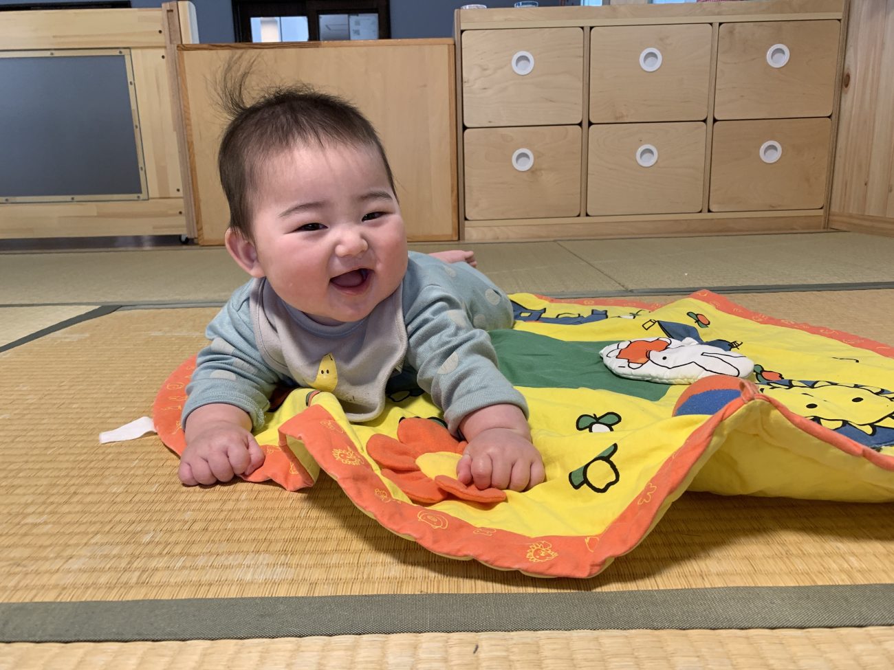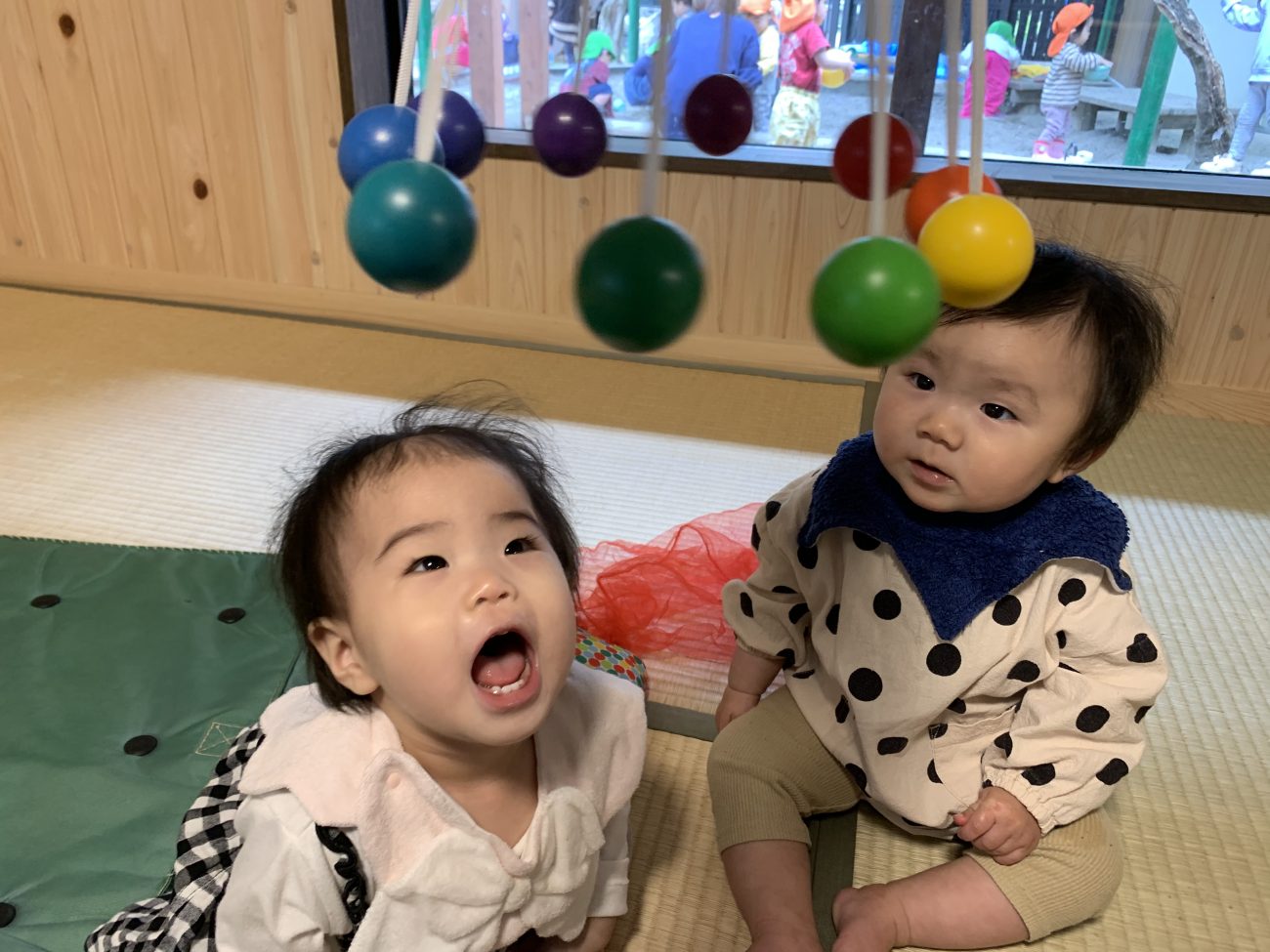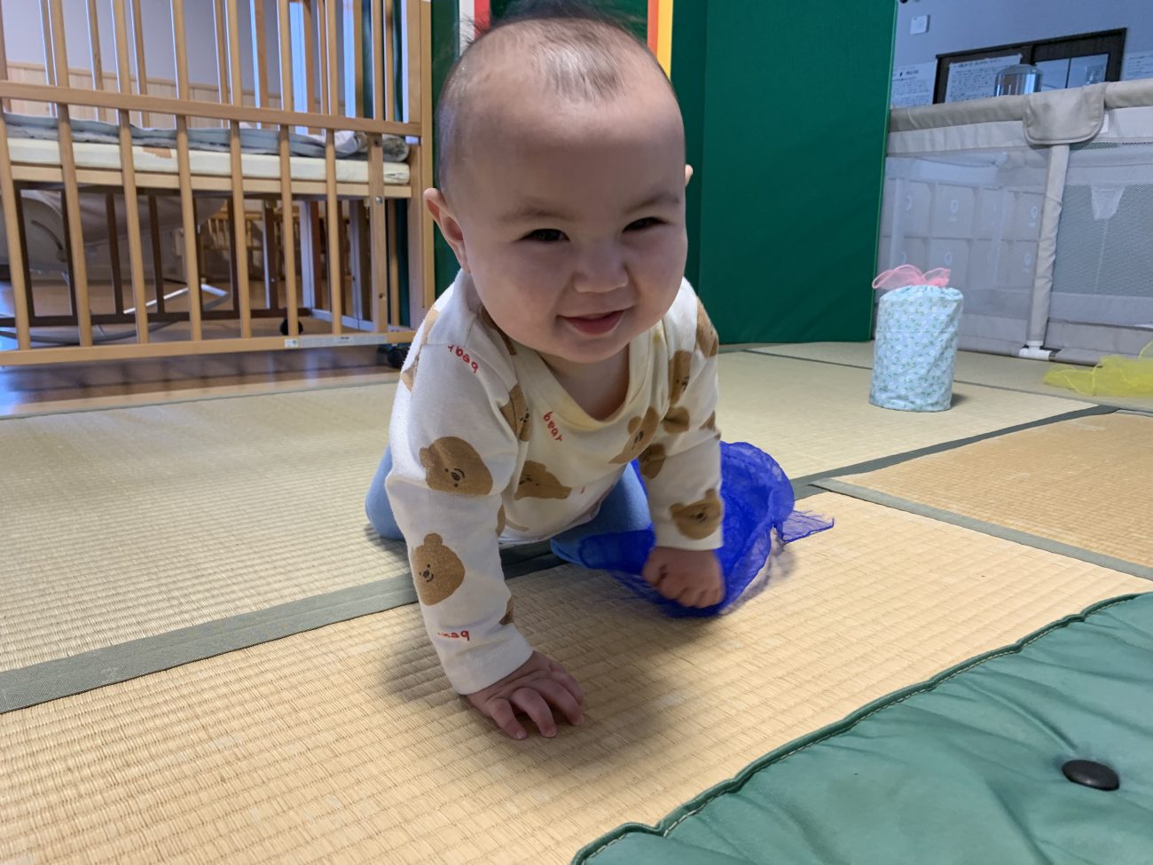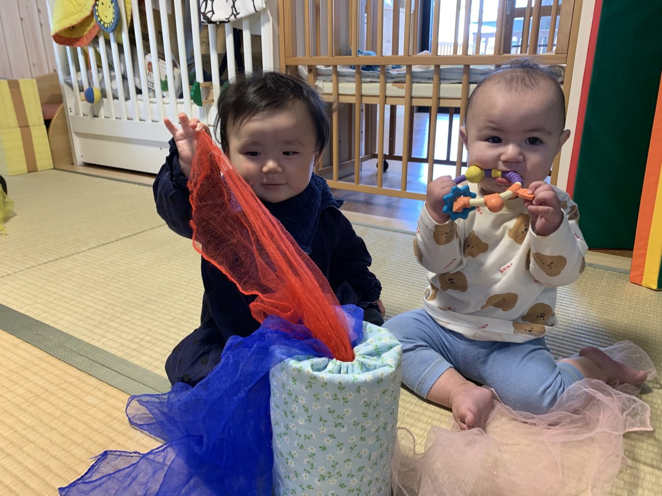 何もかもが人生初めてづくしを体験する6ヶ月から11ヶ月の子ども達。部屋の探索をハイハイや歩いて楽しむ子、鏡の中に保育者を見つけ微笑む子、音楽が聞こえると手足を動かしてノリノリになる子、うつ伏せ仰向けで見た物を触って口で舐めて確認している子等、月齢や発達段階によって遊ぶ姿勢や玩具の興味も様々です。