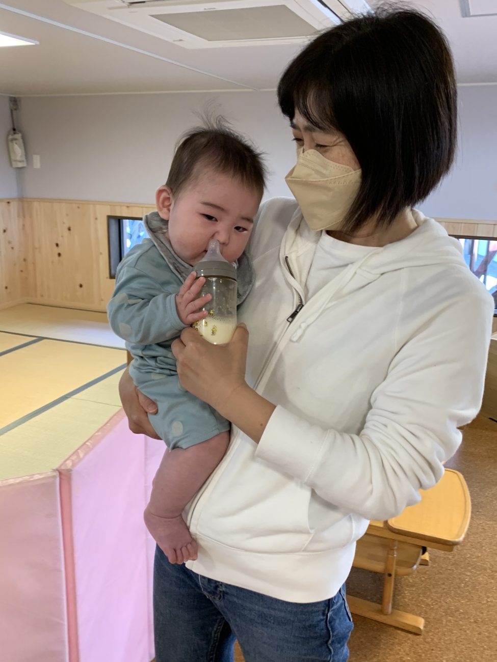 このように毎日同じ保育者が共に生活する中でオムツ交換やオヤツ、ミルクや食事、睡眠等決まった保育者が関わる事で特定の保育者に対して信頼関係や愛着関係が生まれ、睡眠時間やミルクの量も少しずつ安定してきているようです。