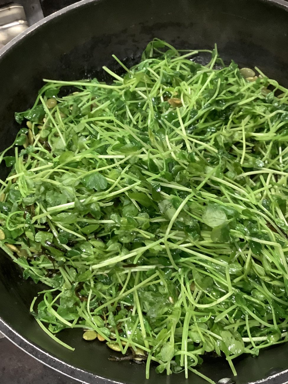 子ども達が育ててくれた豆苗を、胡麻油で甘辛く炒めてみました。