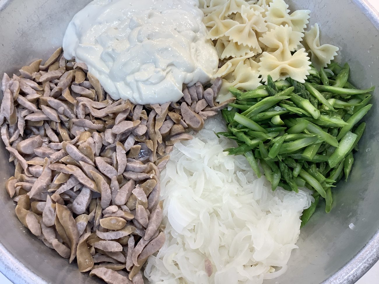 新玉ねぎ、アスパラ、リボン型のマカロニ、南州農場のウインナー、手作り豆乳マヨネーズが入りました。