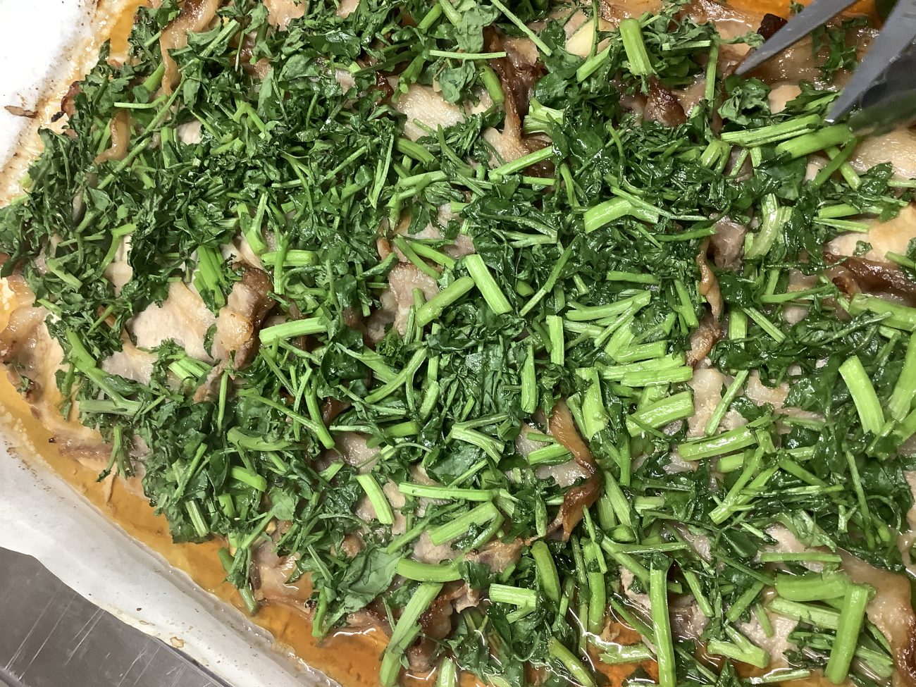 一真から新鮮な豚肉が届きました。スライスしたニンニクと調味料を漬けこみ、スチコンで焼きます。途中で取り出し、クレソンをのせ再度焼きます。