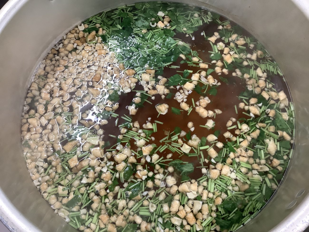 昆布とかつお節で取った出汁を薄口醤油で調味し、絹ごし豆腐、板麩、最後に三つ葉を加えて作ります。三つ葉を鍋に加えると爽やかな香りが広がりました。