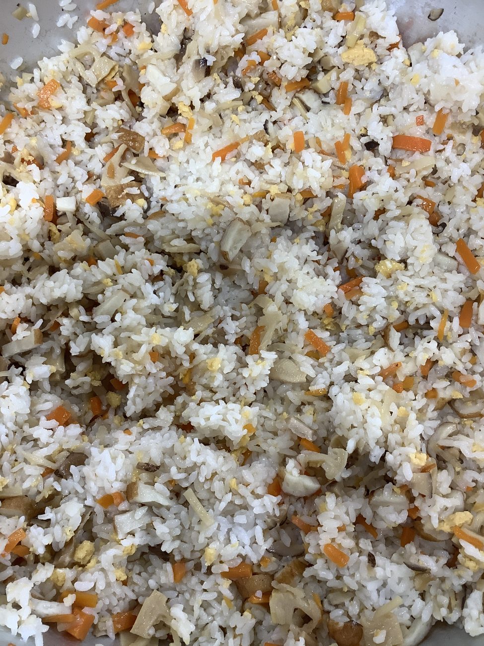 今日は、にんじん、さつま揚げ、切り干し大根、干し椎茸、たけのこ、炒り卵を混ぜた具沢山のさつますもじに仕上げました。酢飯にも鹿児島の特産品の黒酢を混ぜています。