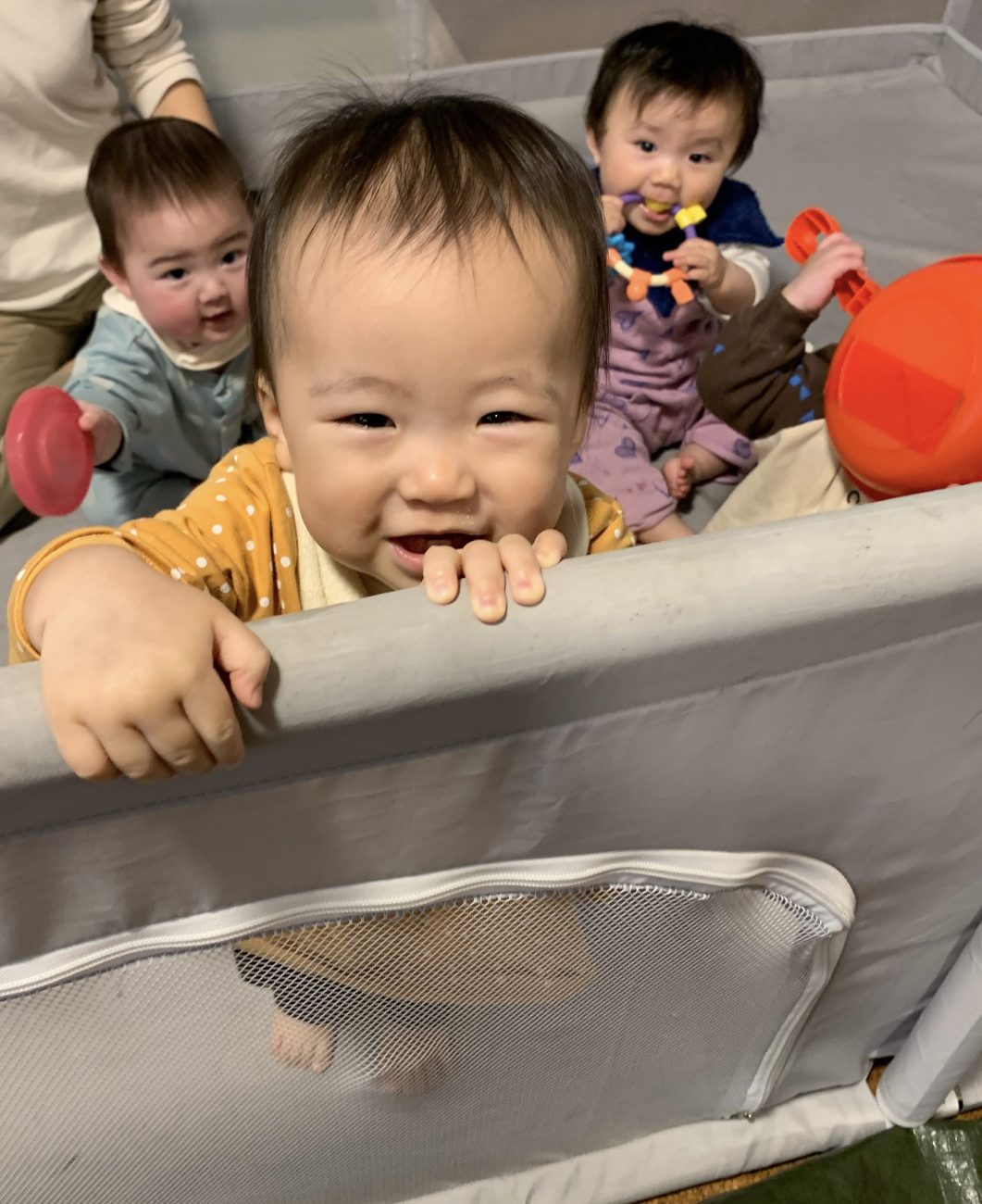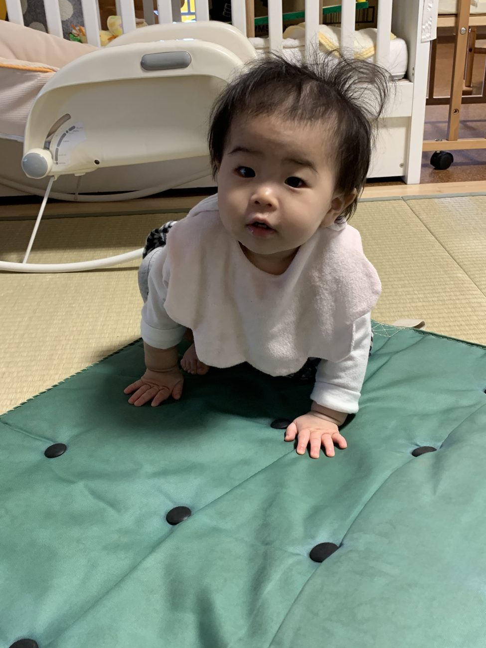 子ども達の目線の先で大人がマットの上に横になって待っていると、嬉しそうにハイハイで向かって来てくれます。友達が動いている様子を見ながらパチパチと両手を合わせるなど、少しずつ、友達の存在にも興味が湧いているようです。