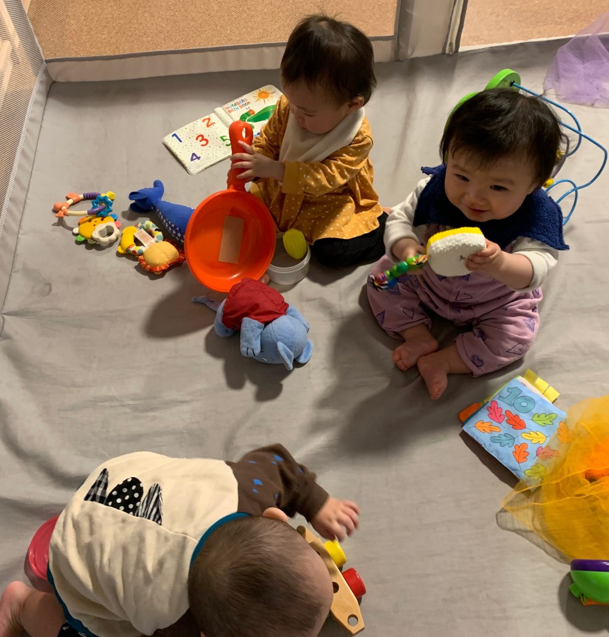 特に0歳児にとっては、見るもの、聞くもの、 触れるもの全てが遊びにつながり、 遊びながら体を動かすことにより視覚、聴覚、触覚、前庭覚( 体の傾きや回転の感覚)、固有受容覚(筋肉などを動かす感覚) が統合され、情緒の安定が生じ、 目的を持った活動が可能になります。