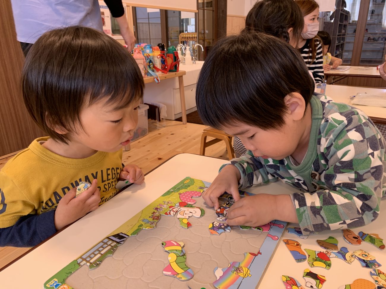取り合いになる場面もありますが、ピースを譲り合う姿や「どこにはめたらいいんだろう?」と一緒に探す姿がみられました。