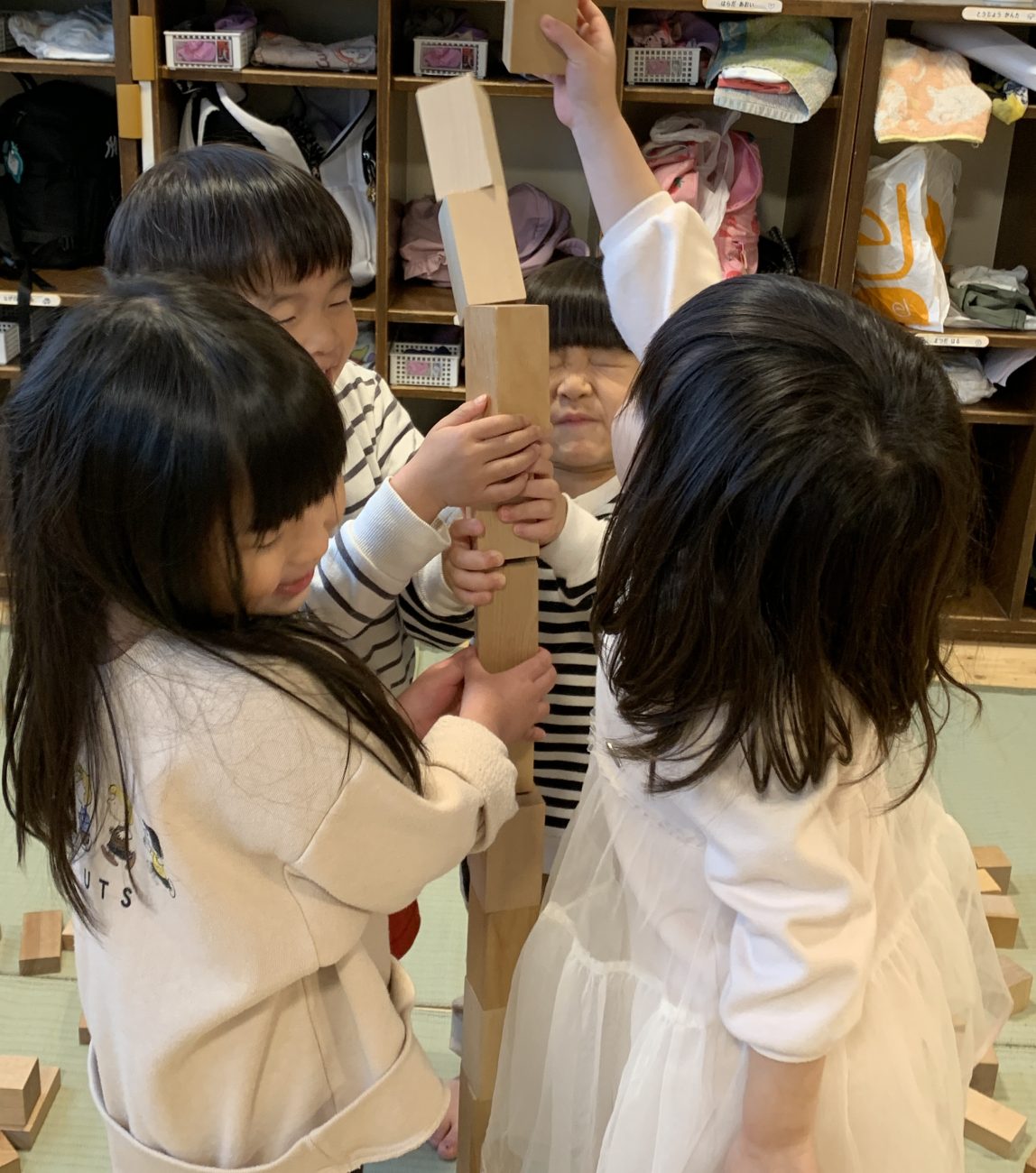 積み木遊びも、大人数で楽しむ姿が増えました。「倒れないように持ってて!」「いくよーせーの!」と声を掛け合い高く高く積んでいました。