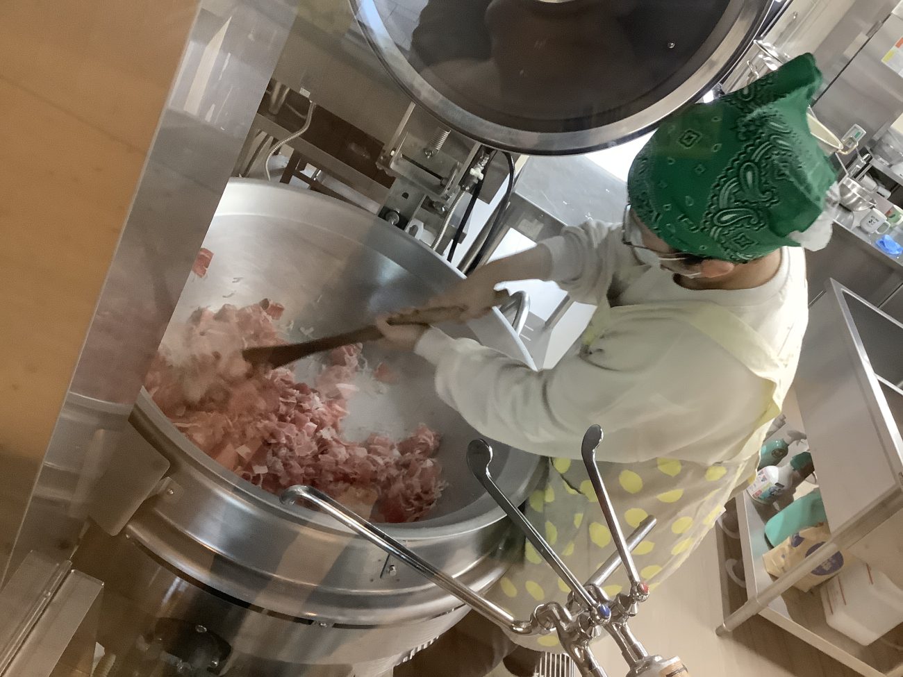 一真から届いた豚肉に、蒸し煮したごぼう、しらたき、人参、ピーマン、薄揚げ、寿草の春雨など、たくさんの具材が入ります。大きな回転釜で炒めるので、豚肉の甘味と野菜の旨味をしっかり感じることができます。