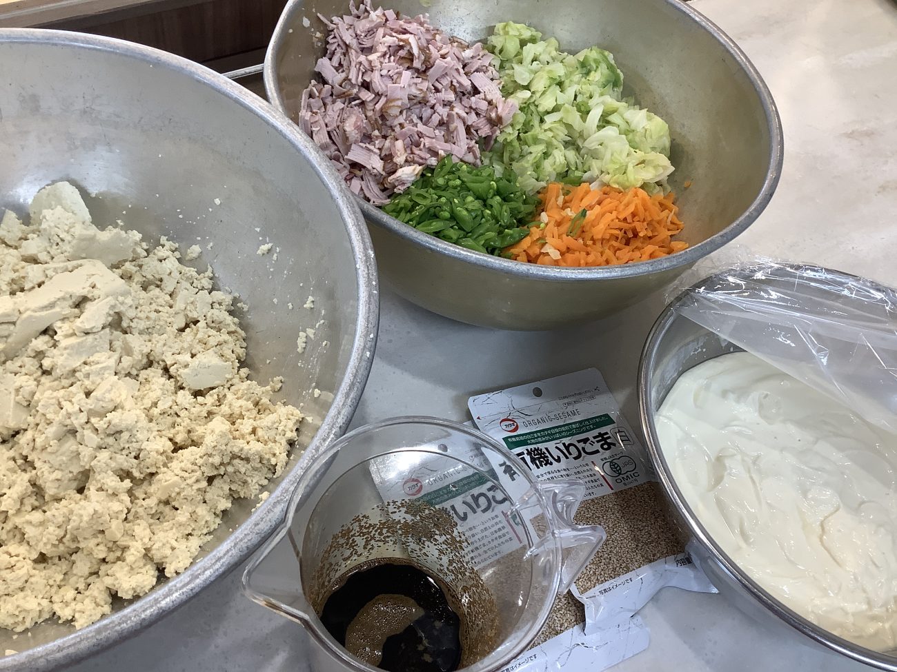 今が旬のキャベツやスナップえんどうなどの春野菜を木綿豆腐、ごま、きび糖、濃口醤油で和えました。