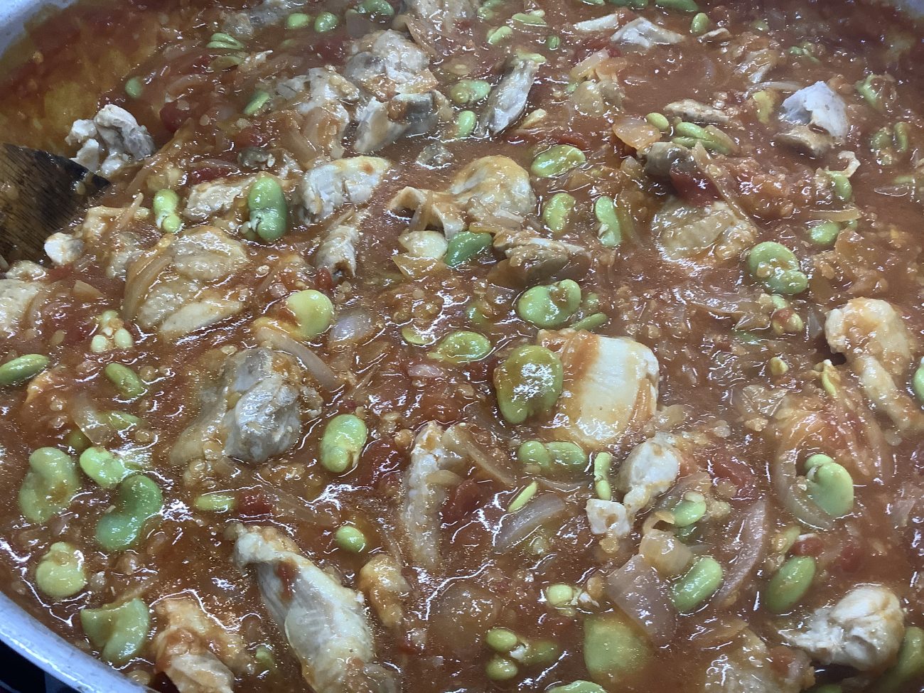 そら豆の甘さと、鶏肉のジューシーさがトマトソースと絡み合い、美味しい一品に仕上がりました。