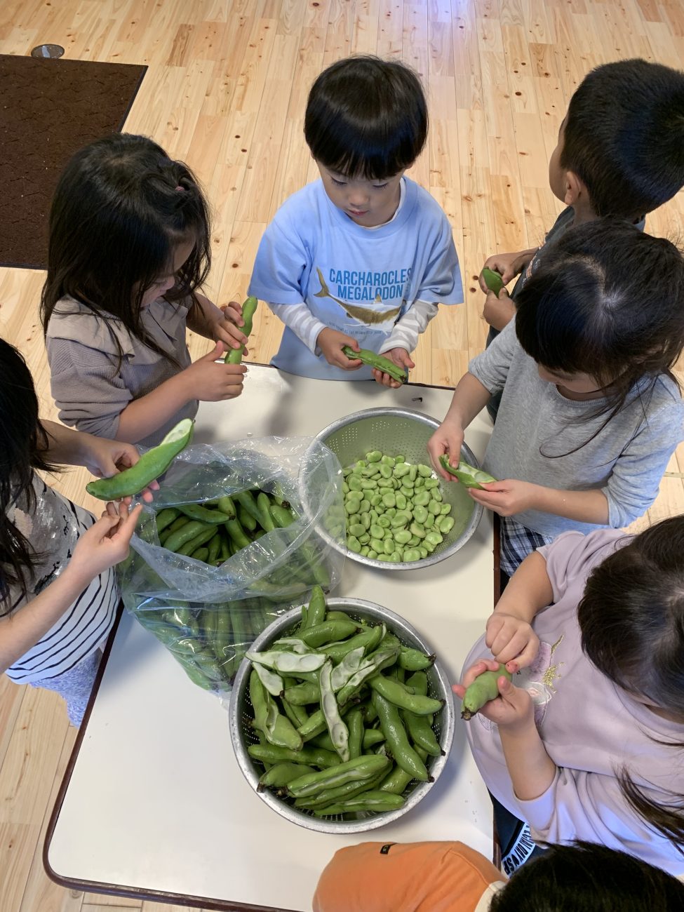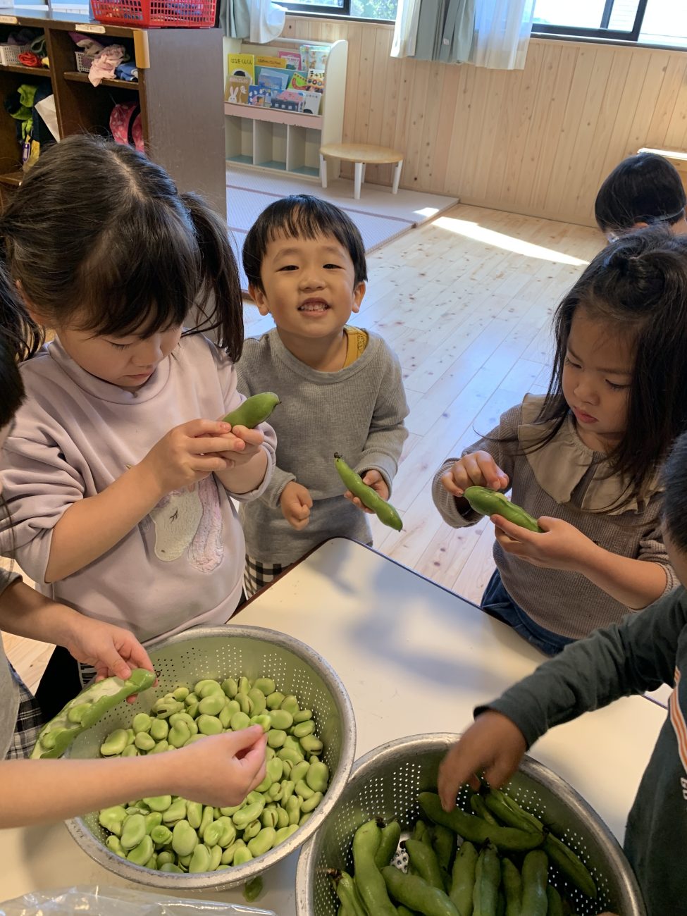 旬のそら豆を、もも組とさくら組の子ども達にむいてもらいました。