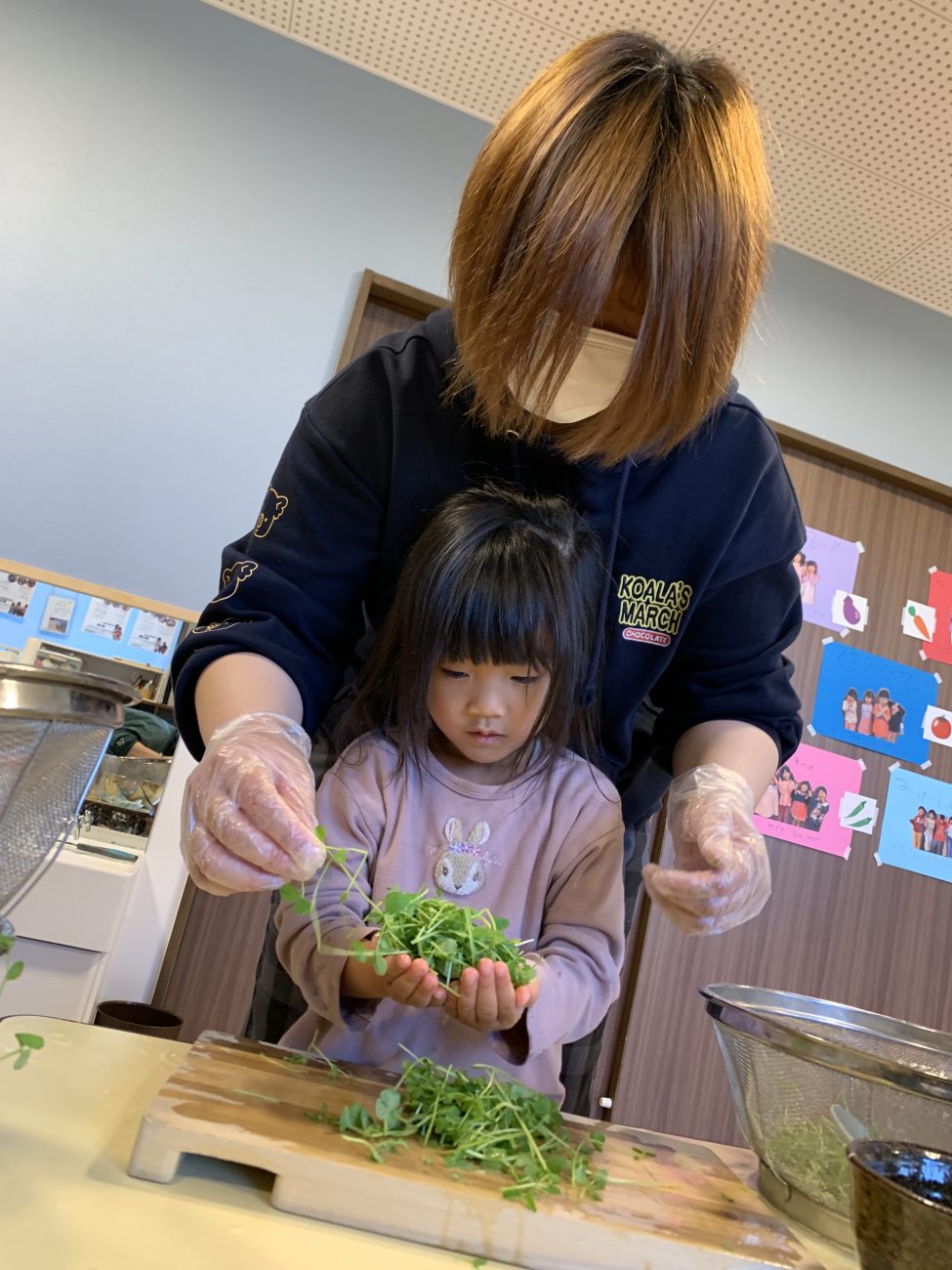 錦ヶ丘では食への興味をもってもらうよう、子ども達に食材に触れてもらう機会を多くつくっています。
