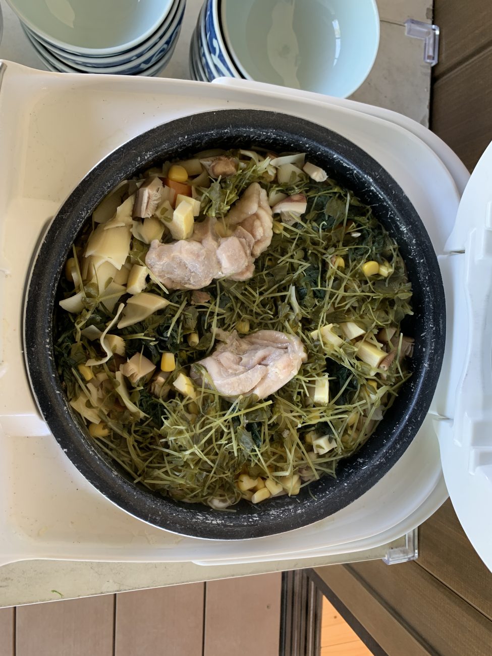 “ 鶏肉、にんじん、たけのこ、椎茸、コーン、よもぎ、クラスで育てている豆苗 ”