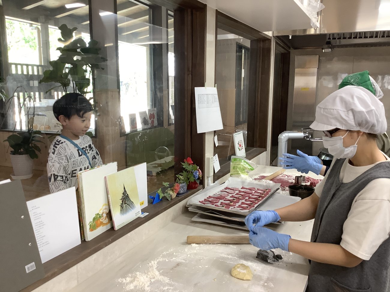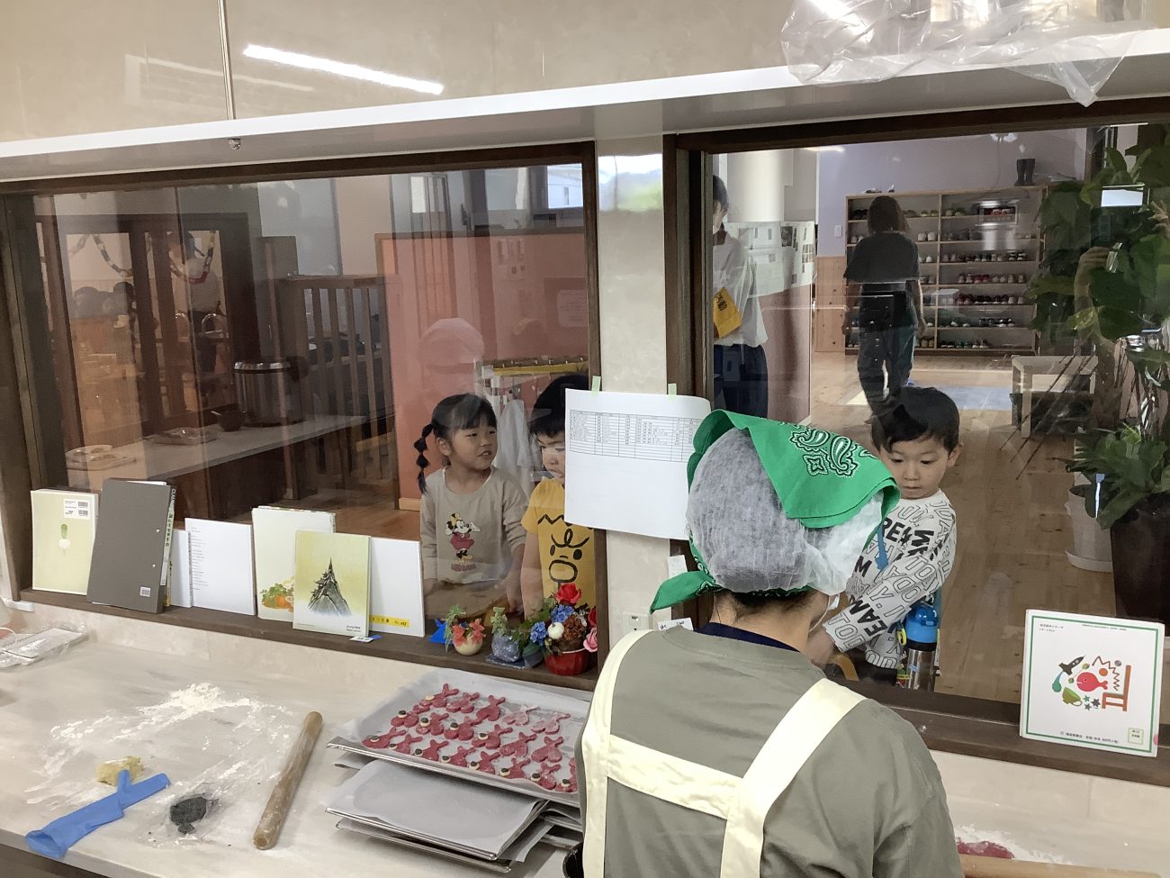 給食室の窓からは、子どもたちがクッキーの型抜きを興味津々に覗いていました。