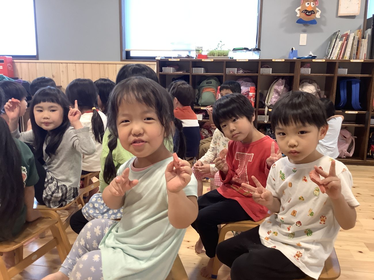 各クラスで絵本の読み聞かせをした後は待ちに待ったおやつの時間!