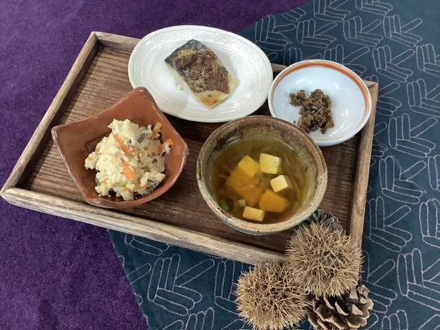水切りをした木綿豆腐に人参、グリンピース、薄口醤油とみりんで煮た椎茸を混ぜたけんちん種を作り、鮭に乗せてオーブンで焼き上げます。