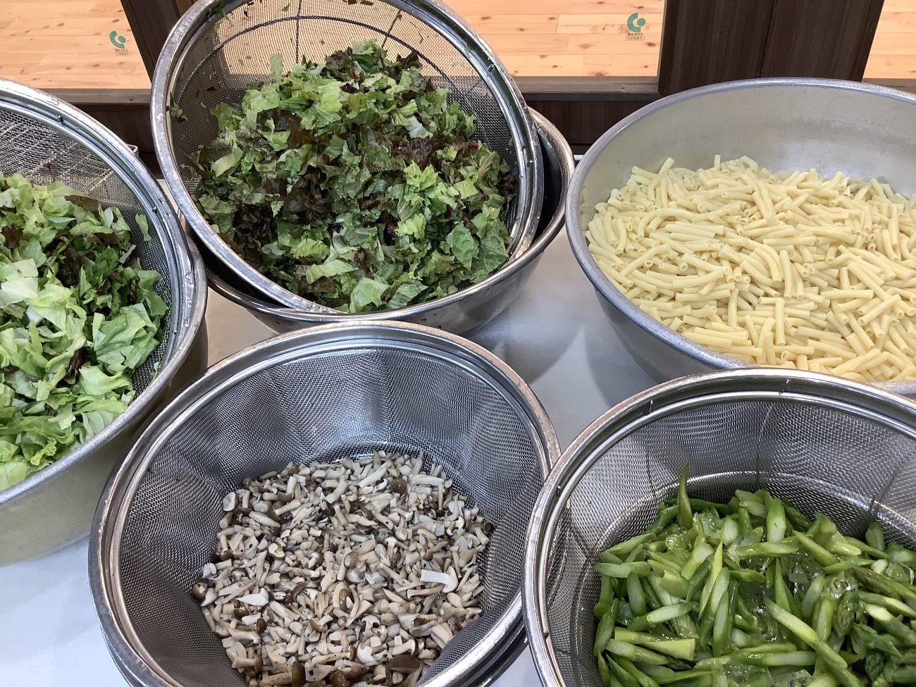 アスパラガス、サニーレタス、レタス、焼いたしめじ、マカロニを合わせて、手作りの醤油ドレッシングをかけて提供しました。