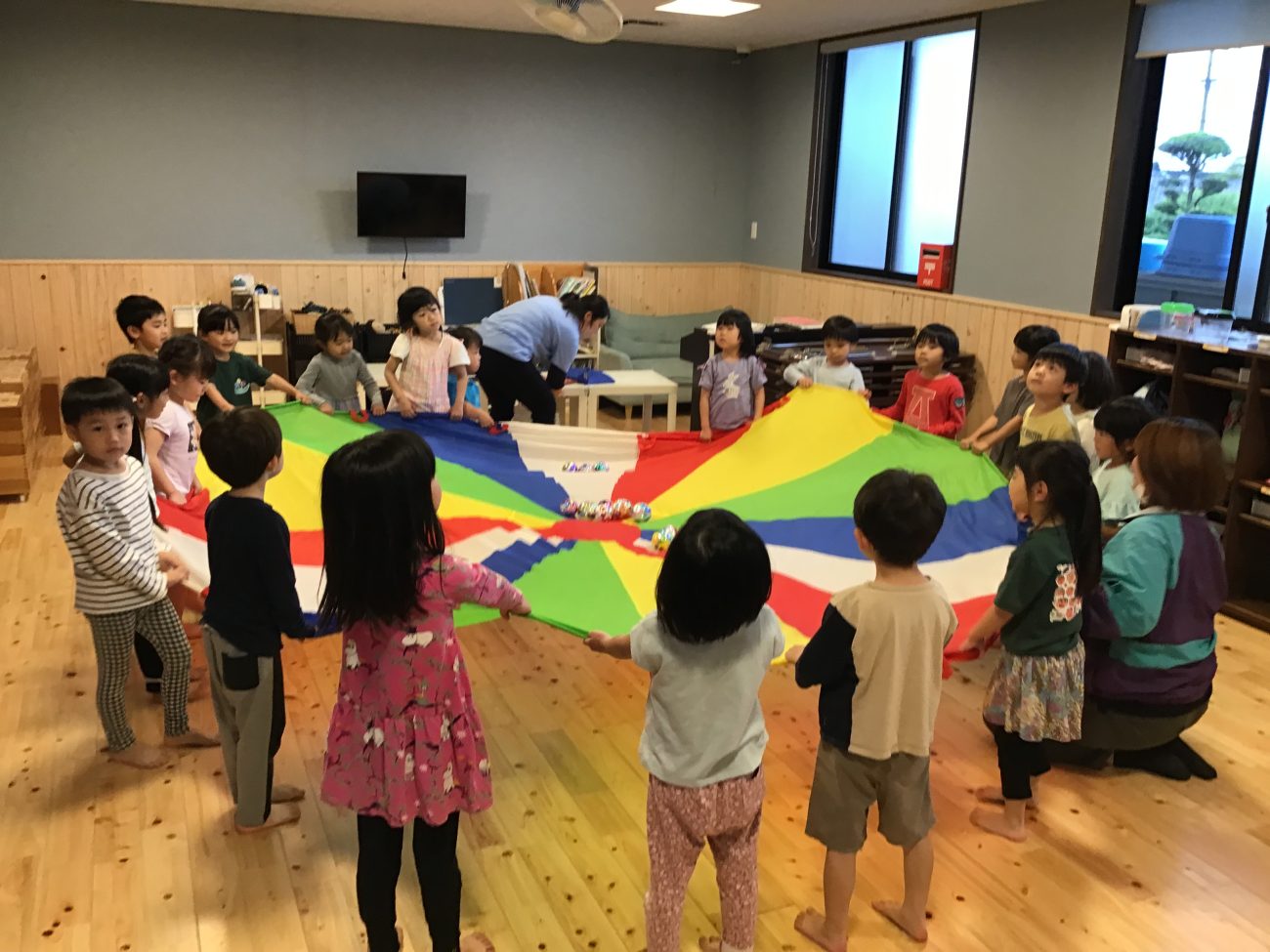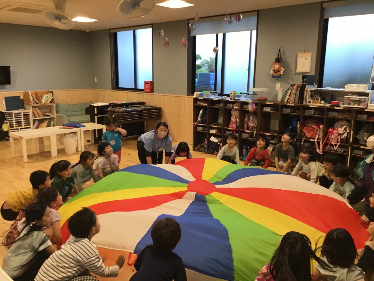 バルーンの動きを紹介しながら子ども達と話し合いを進め、出てきた動きを実際にしてみることに!