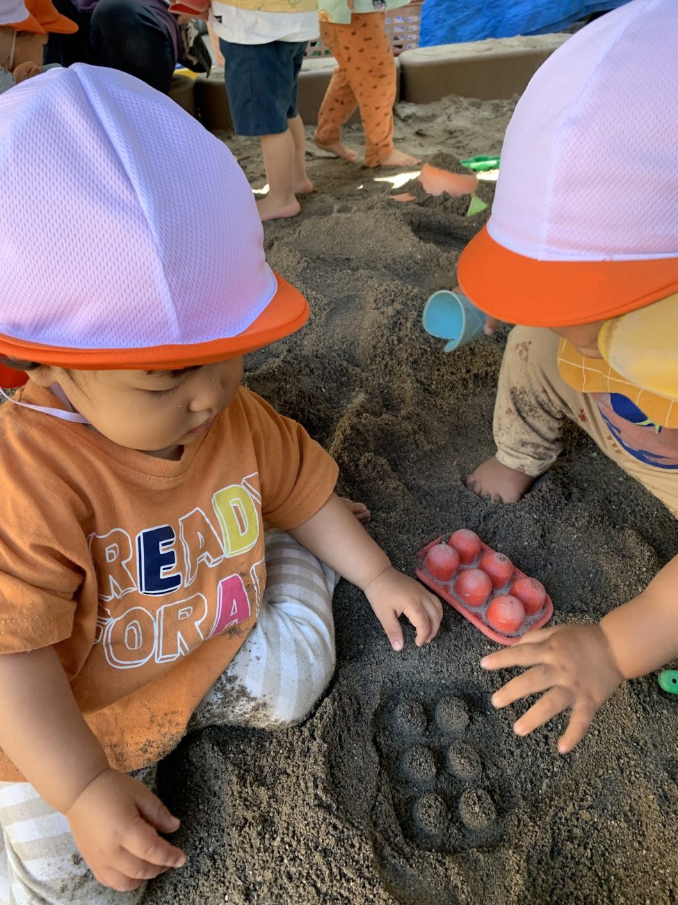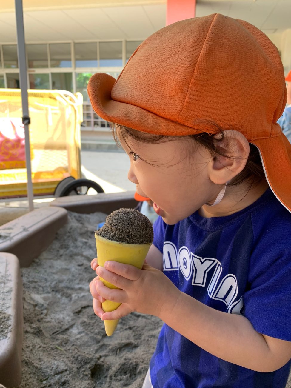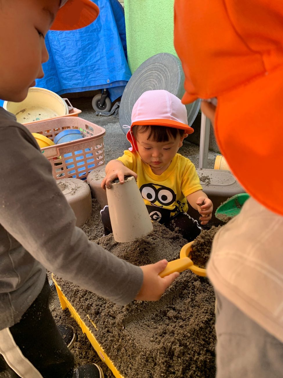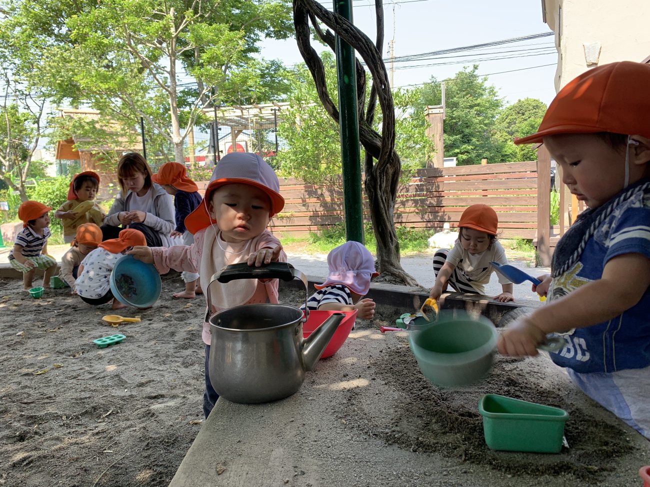 風が心地よく過ごしやすいこの時期。特に戸外に出ることを喜び、最近はよく裸足で園庭遊び砂場遊びを楽しんでいます。私たち保育者も裸足になり、一緒に砂山を作ったり、容器や皿にスコップで砂をすくってままごとなどのごっこ遊びをしたりしています。