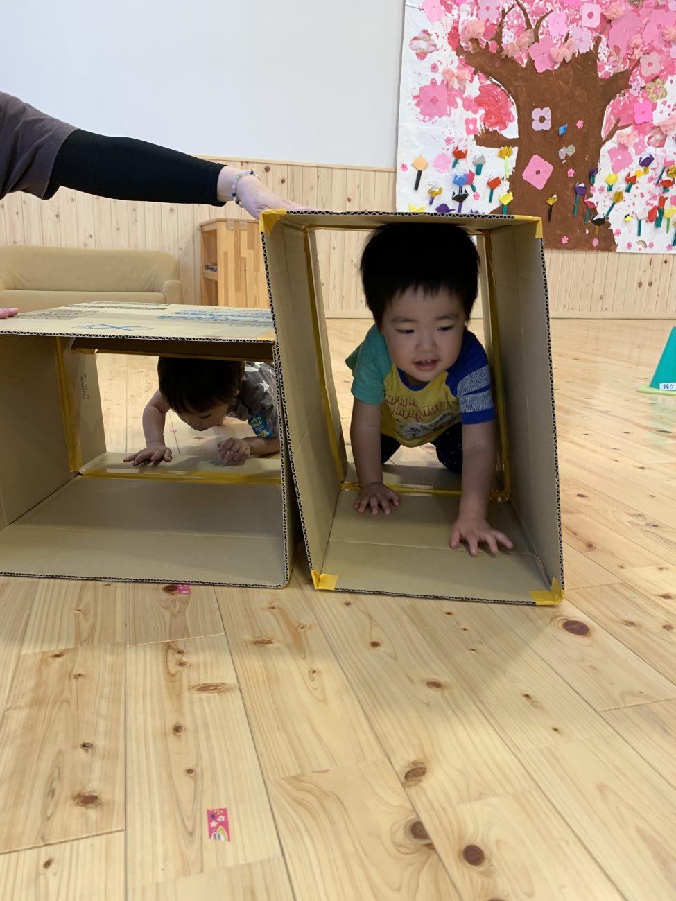 同じ大きさの段ボールを縦と横置きに2箱設置し、くぐります。