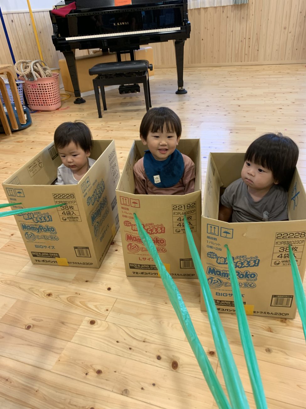 普段はもう少し大きな段ボールに入って、友だちと場所や物の共有ができるようにしていますが、運動会仕様で少しアレンジしてみました。
