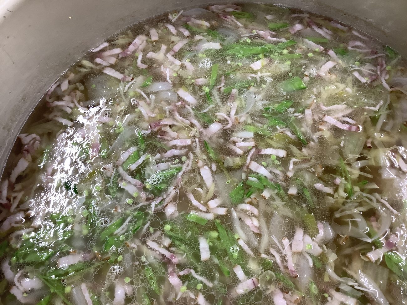 今日は、玉ねぎ、キャベツ、えのきたけ、南州農場のベーコン、さやえんどうの色とりどりの野菜をせん切りにしてスープの具材にしました。