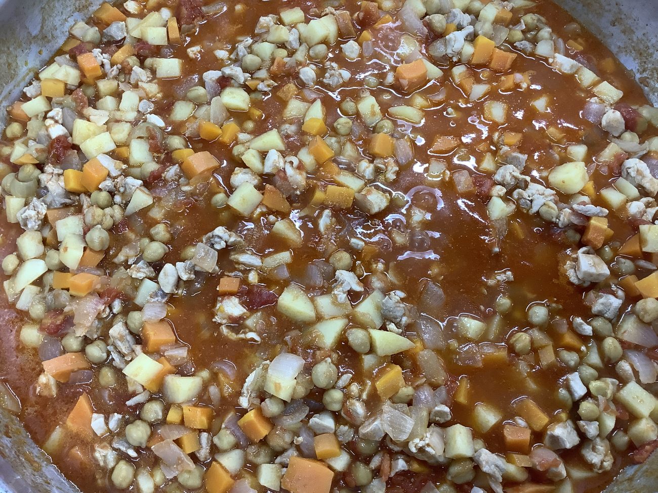 鶏肉、にんじん、玉ねぎ、ひよこ豆をホールトマトと一緒にじっくりと煮込みました。