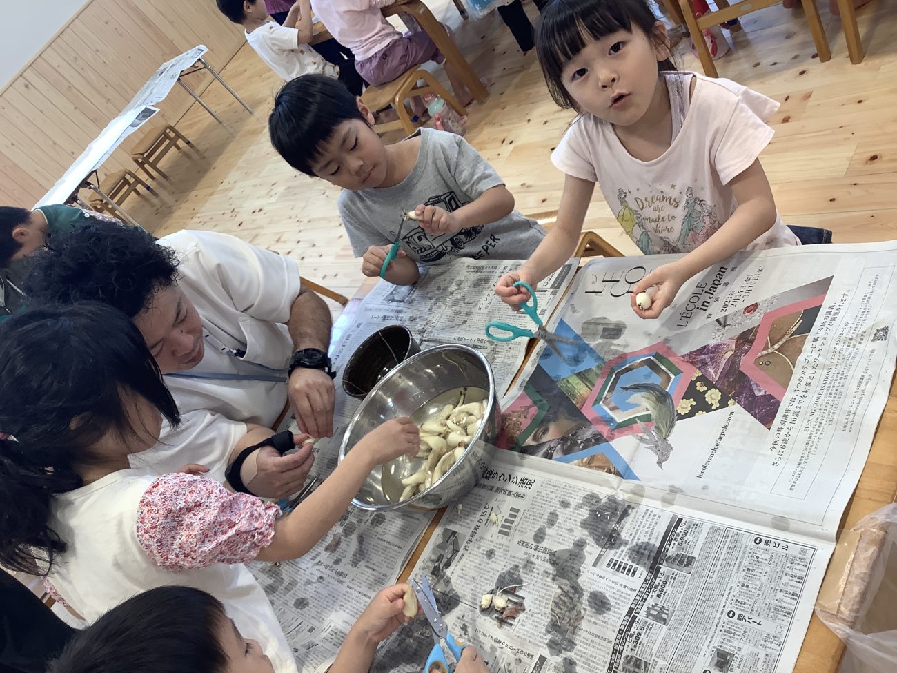 今日は錦ヶ丘プラス+とこども園錦ヶ丘の合同でらっきょう漬けを行いました。