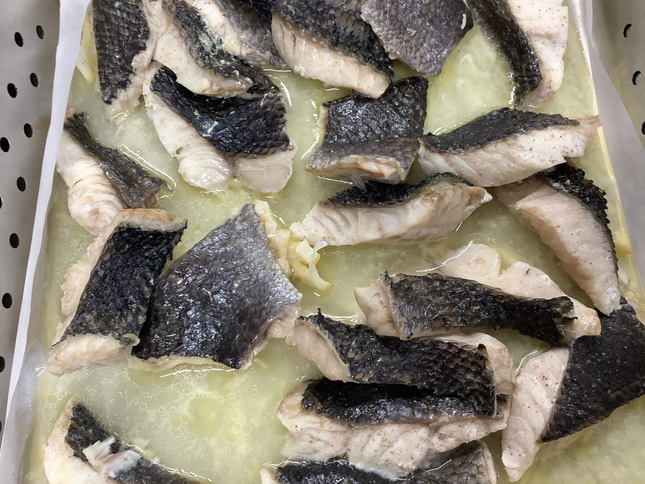 山口水産から届いた黒鯛を、白ワイン、レモン汁、レモンピール、洋風だしとともに漬け込んで、バターをのせてスチームで蒸しました。爽やかな香りとバターのコクが広がる、レモン蒸しになりました。