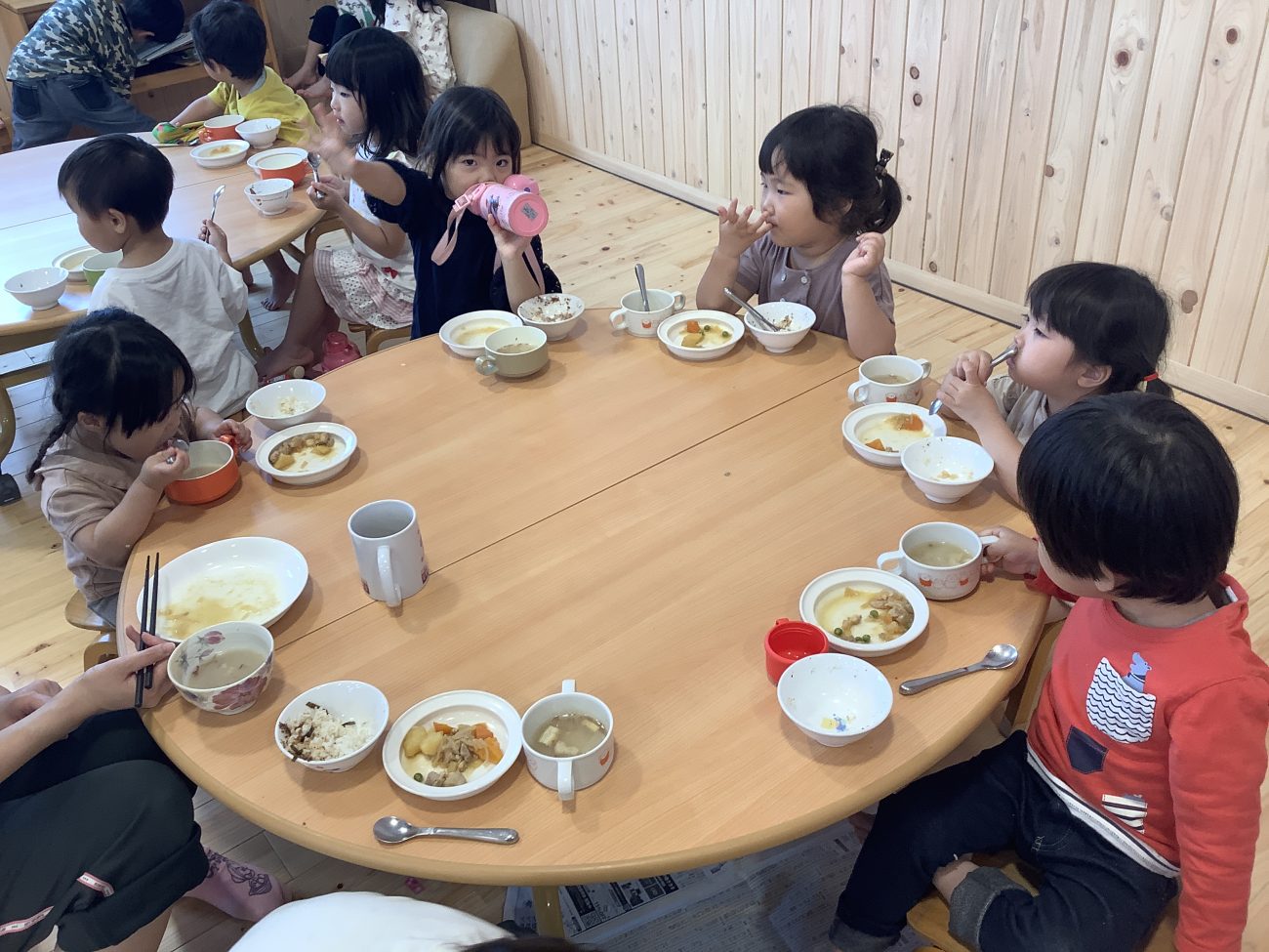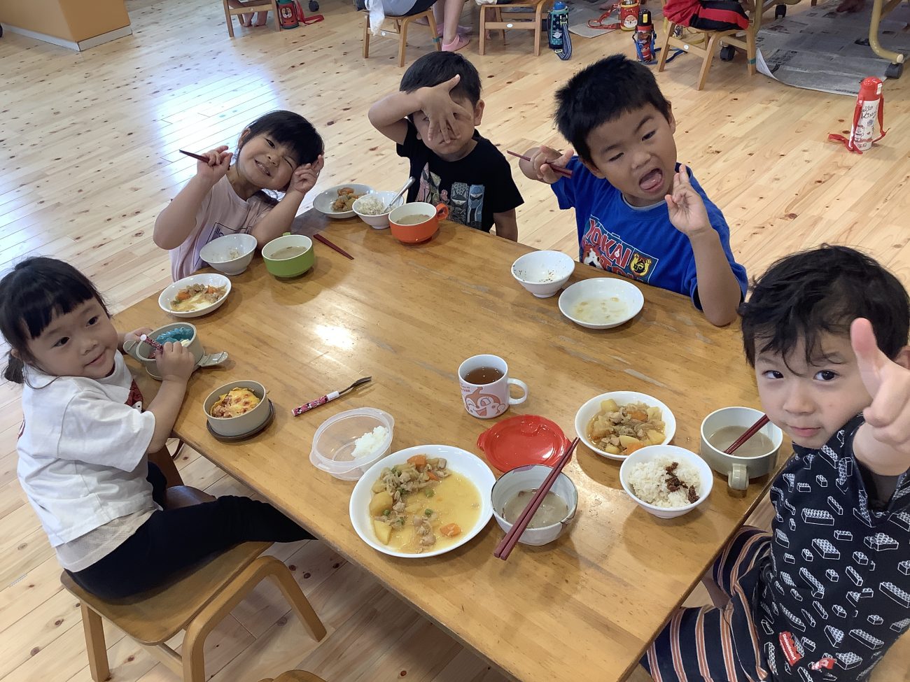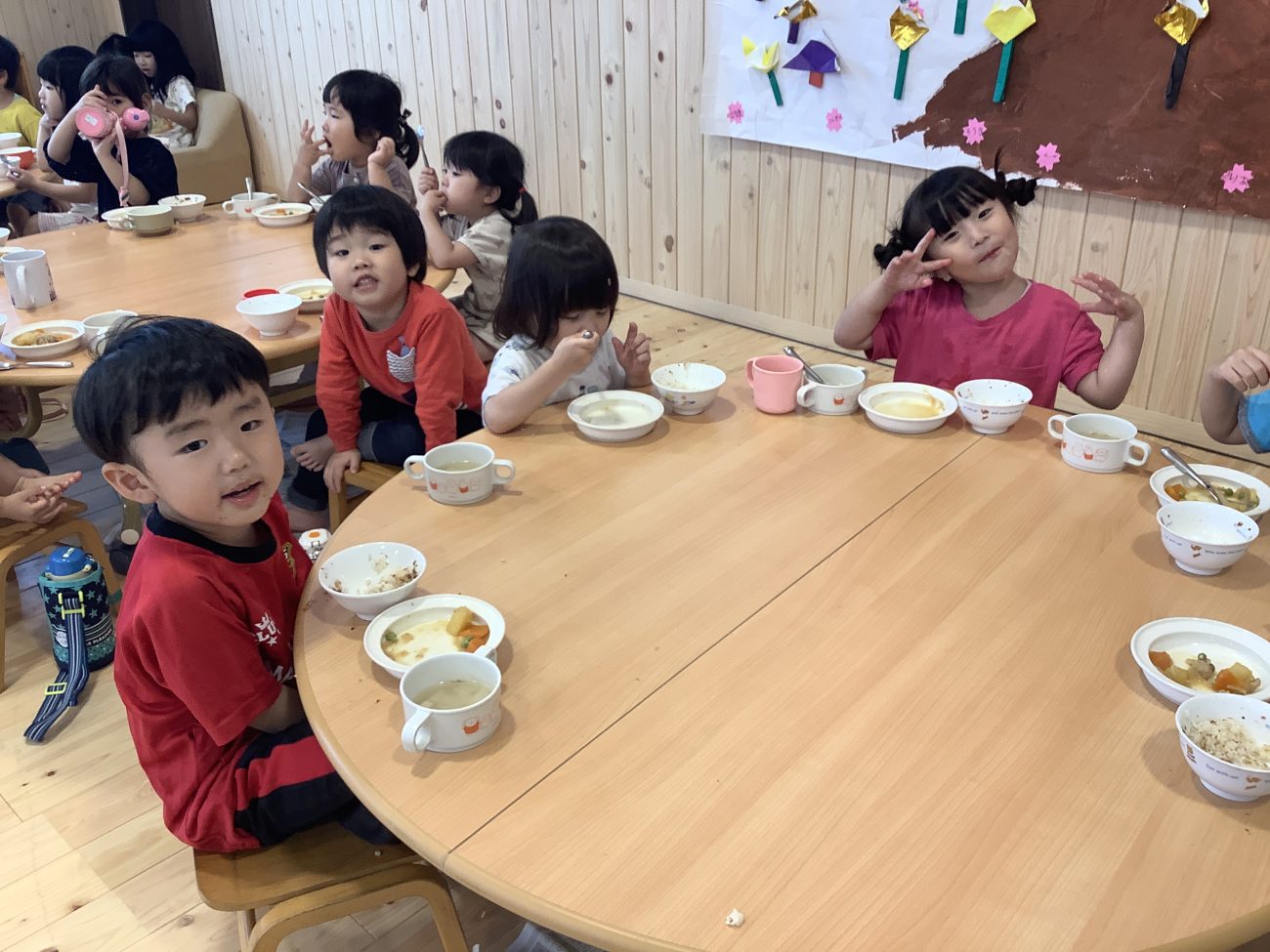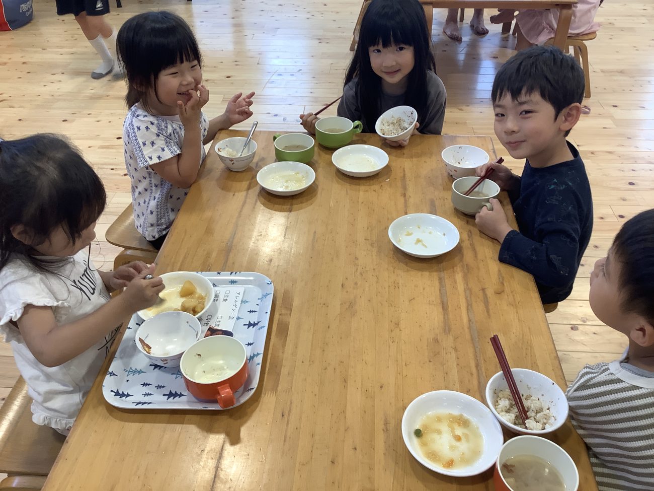 今日は以上児全員でランチルームで給食を食べました。