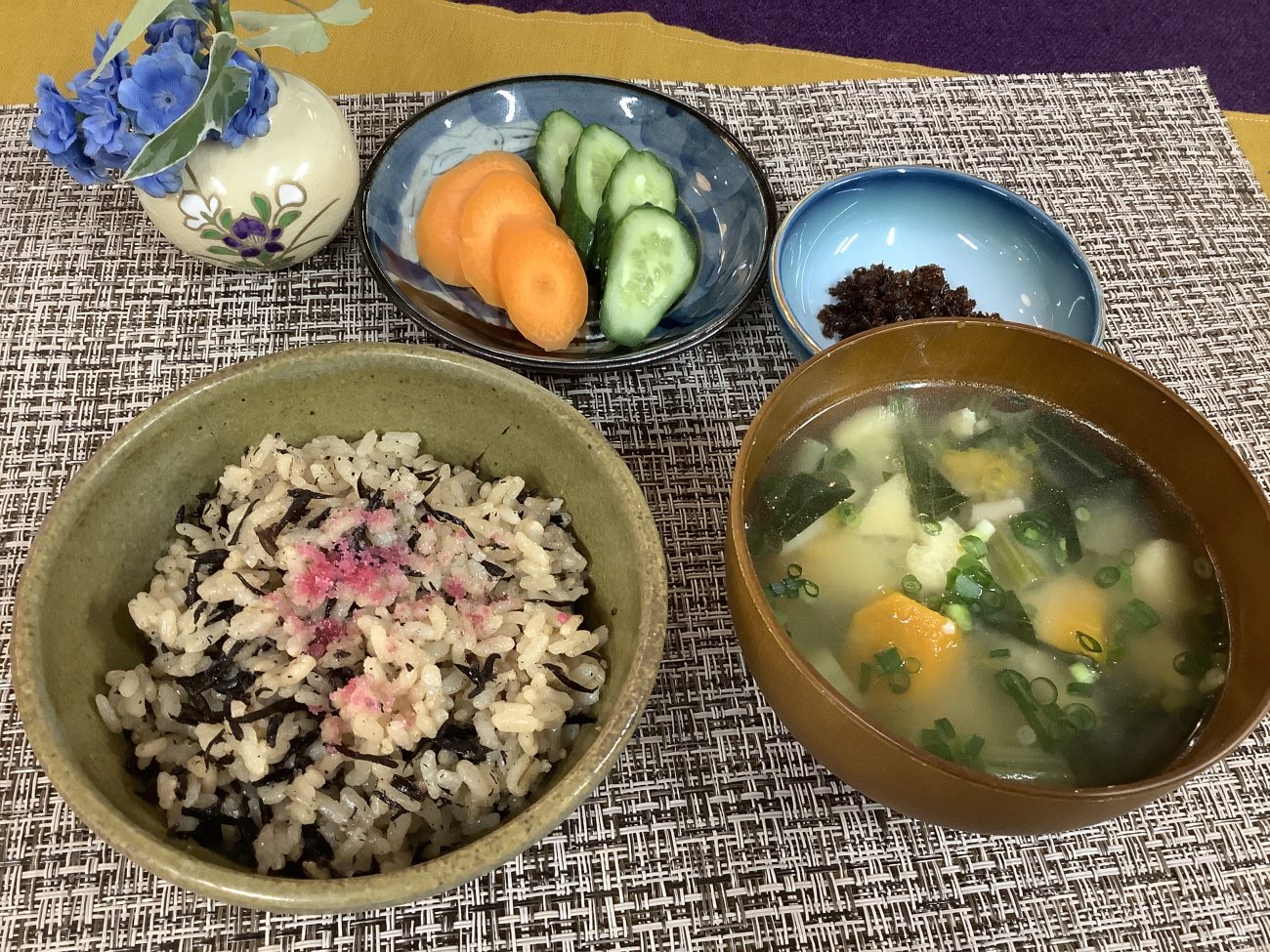 粗食の日は、ご飯と漬物、具沢山味噌汁など動物性たんぱく質を摂らない給食を提供する日です。日本の伝統的な食事を知り、普段の食事に感謝することを目的としています。