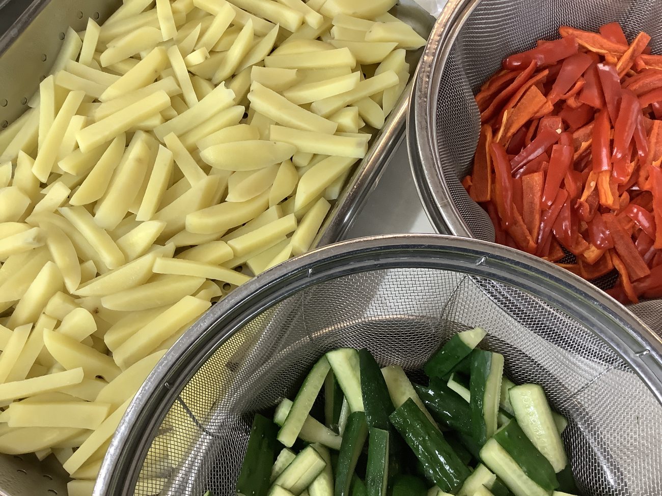 じゃがいも、きゅうり、赤ピーマンをスティック状に切り、スチームで蒸します。手作りの豆乳マヨネーズを一緒に添えて提供しました。