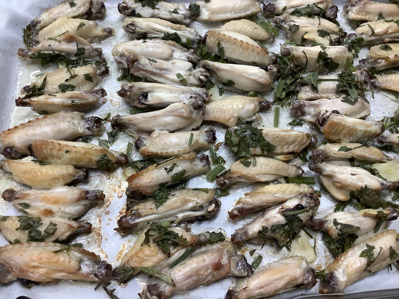 ニコニコ畑から届いたハーブと白ワイン、にんにく、オリーブオイル、塩胡椒で骨付きのチキンバー(未満児は鶏もも肉)を漬け込んでオーブンで焼き上げました。
