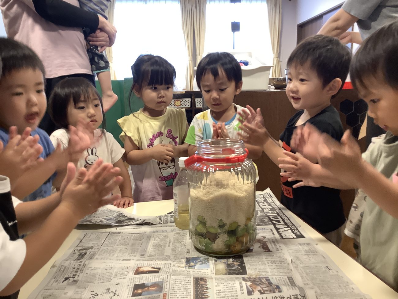 「どんな梅シロップが出来上がるかな?」「おいしくなーれ!」とみんなで声をかけながら瓶に詰めていきます!