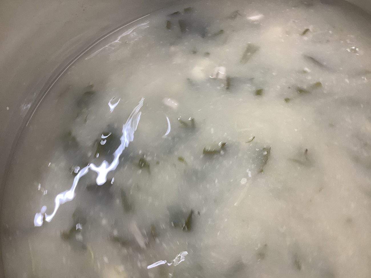 昆布、かつお節、いりこで出汁を取り、わかめ・水菜・ぶなしめじ・豆腐を煮込んでいます。