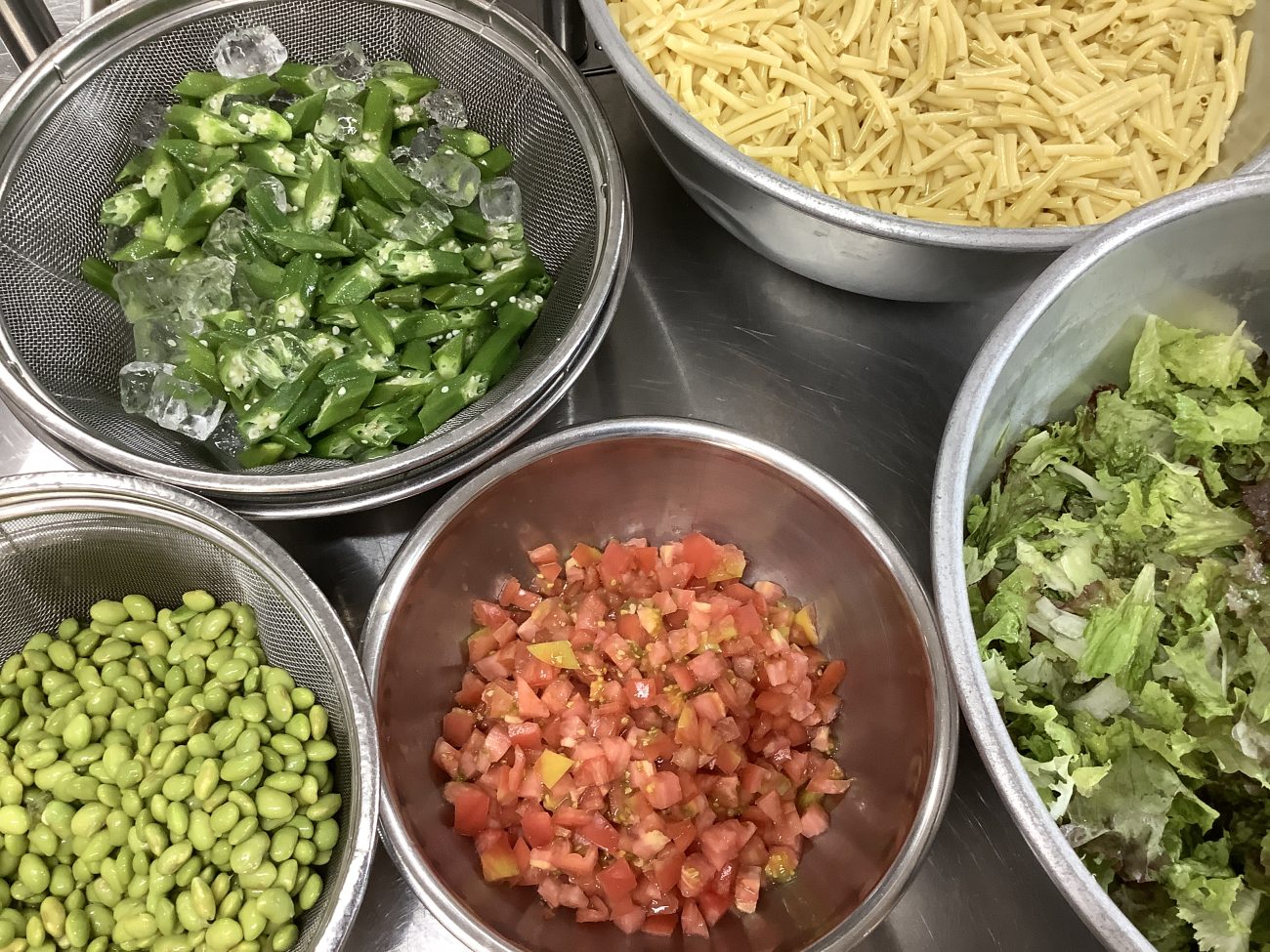 枝豆・トマト・オクラ・サニーレタスとマカロニを豆乳マヨネーズで和えました。