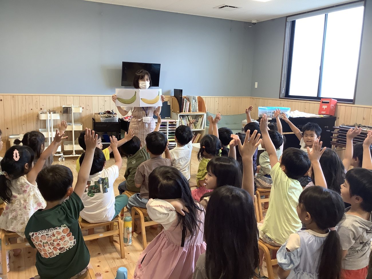 「バナナのおしごと」をテーマに、「美味しいバナナの色は?」「バナナは体の中でどんなお仕事をするかな?」など楽しく勉強ができる時間を過ごしました。