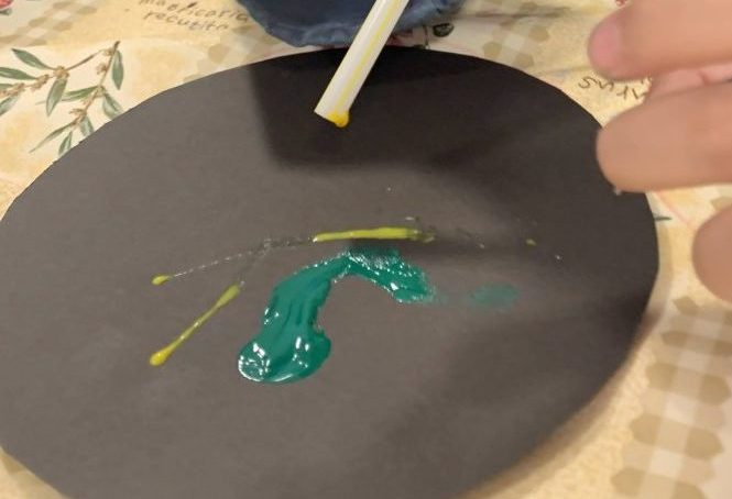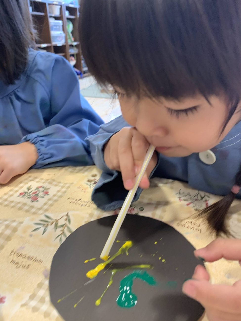 又、指で絵の具を混ぜて黒い画用紙にのびのびと塗ったり、ストローを筆代わりにしたりして花火を描いたりする子もいました。